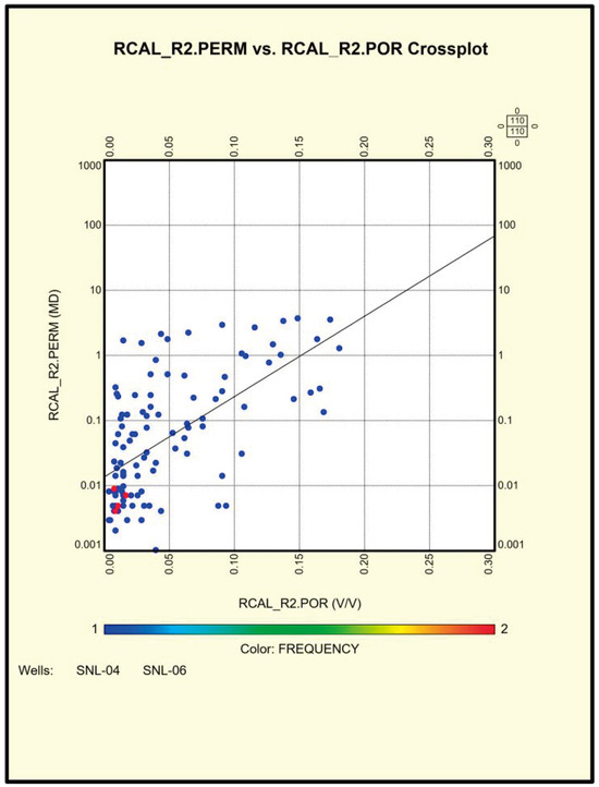 Permeability and its distribution are some of the most basic geological parameters to describe the properties of reservoir rock [17]. Since the fluid must pass through the pores of the reservoir rock, permeability is considered the main criterion in determining the optimal methods of increased harvesting and investigation of the behavior of production from the reservoir. Porosity and permeability are closely connected, and its relationship is a very important parameter for the characterization of carbonate reservoirs [17,18]. This relationship has been established in cores from the Upper Dalan Formation (Figure 7) and used to calculate the average permeability obtained in Kangan Formation and Upper Dalan formations (Table 2).