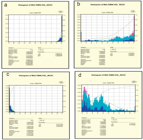 Vsh frequency diagrams of the studied formations. (a) upper Dalan Formation in Well 4. (b) Kangan Formation in Well 4. (c) upper Dalan Formation in Well 6. (d) Kangan Formation in Well 6.