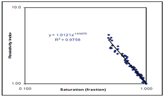 Water saturation Exponent n is one of the important and key parameters in determining water saturation. This parameter is usually obtained from the analysis of the electrical properties of the core. To obtain this parameter, the logarithmic graph of saturation index (Rt/Ro) against water saturation should be drawn for core data. The slope of the line fitted to the drawn points indicates the Water Saturation Exponent, which has been calculated as 1.92 in this study (Figure 10).