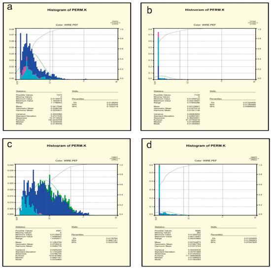 Permeability frequency diagrams of the studied formations. (a) Upper Dalan Formation in Well 4; (b) Kangan Formation in Well 4; (c) Upper Dalan Formation in Well 6; (d) Kangan Formation in Well 6.