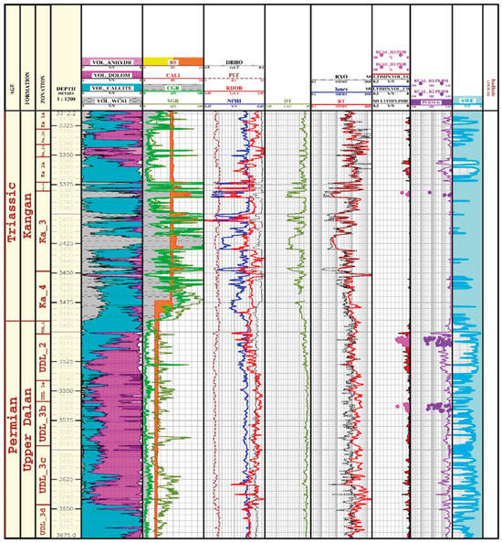In addition to quantitative cut-offs of porosity, water saturation, and shale volume, the boundaries of key reservoir zones (e.g., Ka-2a, UD-2) were further justified by considering diagenetic and structural features. Core descriptions and borehole image logs indicated that zones such as UD-2 displayed enhanced secondary porosity due to dissolution and dolomitization, as well as a higher frequency of open microfractures, both of which improve reservoir quality. In Ka-2a, the presence of intercrystalline dolomite, vuggy porosity, and evidence of late-stage diagenesis align with the best reservoir intervals confirmed by production data. These geological observations provide an independent basis for the zonation scheme, strengthening interpretations derived from petrophysical parameters alone.