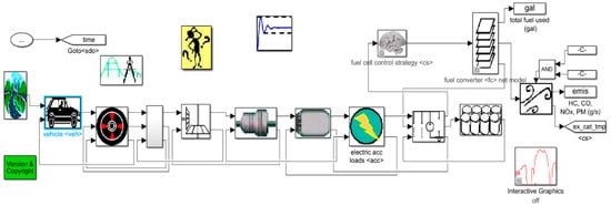 The ADVISOR is a well-recognized MATLAB/Simulink framework created by the National Renewable Energy Laboratory (NREL) for the purpose of simulating vehicle performance. Its adaptability enables researchers to develop vehicle models by either choosing from an extensive library of predefined components (including batteries, fuel cells, and wheels) or by incorporating custom-designed component models. This capability facilitates the assessment of various powertrain configurations across a diverse array of driving cycles. In addition to computing essential vehicle performance metrics such as acceleration, gradeability, and maximum speed, ADVISOR allows for a detailed examination of the system’s dynamic behaviour, enabling the analysis of time-series data from individual components, including the battery’s state of charge, the fuel converter’s operational efficiency, and the electric motor’s power output throughout the simulation period [,,].
