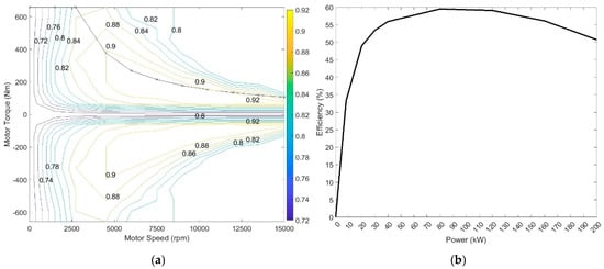 The performance of the primary powertrain components is defined by their respective efficiency characteristics within the ADVISOR model. The efficiency profile of the 187 kW AC induction motor, as a function of its speed and torque, is depicted in Figure 2a, showing a peak efficiency of approximately 92%. The 200 kW fuel cell system is characterized by its power-dependent efficiency curve, presented in Figure 2b. This curve illustrates that the fuel cell achieves its maximum efficiency of around 60% at a partial load (approx. 80 kW) and operates at lower efficiencies at very low or high power outputs. Fuel cell models exhibiting similar non-linear efficiency characteristics have been employed in comparable FCEB studies [,].