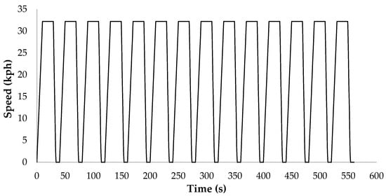 To accurately simulate the dynamic conditions of urban bus operation, the CBD driving cycle was selected for this study. This chassis dynamometer test is characterized by its composition of frequent acceleration, cruising, and deceleration phases, making it highly representative of demanding inner-city transit. The test protocol specifies a total duration of 560 s and covers a distance of 3.2 km. Due to its realistic nature, the CBD cycle is frequently employed in the literature as a standard benchmark for evaluating the performance of heavy-duty vehicles [,]. The speed-time profile of the cycle is depicted in Figure 3.