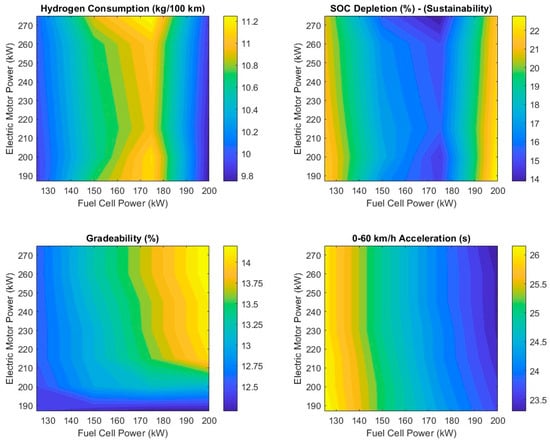 An analysis of the vehicle’s gradeability, which is calculated at a constant speed of 20 km/h, reveals a non-linear relationship where the electric motor’s influence becomes significant only above a certain power threshold. This is visually evident in the corresponding contour plot in Figure 4. For electric motor power ratings below approximately 215 kW, the contour lines are nearly horizontal and concentrated in the lower performance region, indicating that gradeability remains consistently low, around 12–13%, regardless of the fuel cell power. However, a distinct performance improvement is observed once the electric motor power surpasses 215 kW. In this higher power region, the fuel cell becomes the primary determinant of gradeability, with performance increasing along the y-axis.