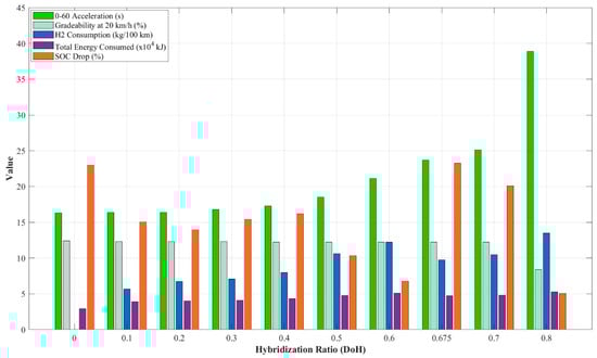 Figure 5 provides a comparative examination of five essential metrics across ten different , highlighting the critical trade-offs between vehicle performance, energy usage, and the SOC of the battery. The grouped bar chart facilitates a straightforward visual evaluation of the progression of these indicators as the powertrain transitions from a battery-dominant to a fuel-cell-dominant architecture.