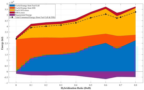 This trend is explained by the shifting contribution of the powertrain components. As expected, with a higher , the energy supplied by the fuel cell increases. Conversely, the useful energy delivered by the battery (orange area) diminishes significantly at higher values. A more detailed look at the secondary energy flows reveals that ESS losses remain relatively constant. This, combined with the significant energy recaptured through regeneration (purple area), strongly suggests that the battery energy pathway is more efficient than the fuel cell route for the given driving cycle.