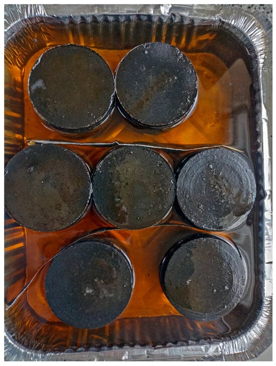 where m0 is the initial dry mass and m(t) is the mass at time t [40]. After 4 days of immersion, briquettes were evaluated for wet strength by performing a gentle compression test (some briquettes were too fragile to test fully when wet; in those cases, a qualitative assessment “disintegrated” was noted) [41]. Subsequently, the soaked briquettes were dried in air for 24 h and then in an oven (60 °C, 24 h) to remove absorbed moisture. These re-dried briquettes were then tested for compressive strength to see how much of the original strength was [42]. Any visible physical changes (cracks, deformation) were recorded [43]. Representative soaked briquettes are shown in Figure 3.