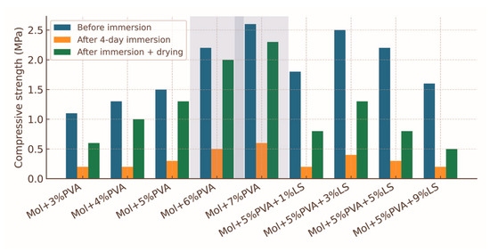 The compressive strength data for the 0–1 mm fraction briquettes bound with molasses and varying PVA contents are shown in Figure 4 and summarised in Table 1. Before water immersion, briquettes with 3% PVA exhibited a mean compressive strength of 1.1 MPa, which progressively increased with higher PVA content, reaching 2.6 MPa at 7% PVA. This represents an overall increase of 136% relative to the lowest binder loading. The increase in strength is attributed to the enhanced formation of a continuous PVA–molasses matrix, which improves interparticle adhesion through hydrogen bonding between hydroxyl groups of PVA and carbohydrate components of molasses, as well as by creating a denser film over particle surfaces [12,13].