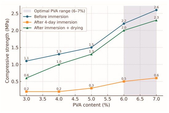 Compressive strength of briquettes (0–1 mm fraction) with varying PVA binder content before water immersion, after 4 days of immersion, and after drying. Error bars indicate standard deviation (n = 3). The shaded area highlights the optimal range of PVA content (6–7%) for maximum dry and post-drying strength.