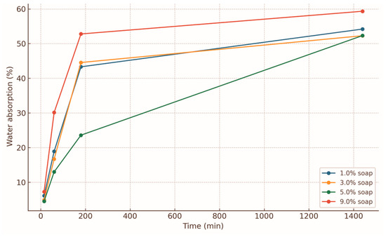 Liquid soap additions to 5% PVA + 20% molasses briquettes modified water absorption behaviour in complex ways (Figure 6). At 1% soap, 15 min uptake was 6.12%, rising to 18.90% at 60 min, and stabilising around 54% after 1 day. At 3% soap, slightly lower early uptake (4.93% at 15 min) was observed, but similar saturation (~52.2%). At 5% soap, initial uptake was 4.53% at 15 min, but irregular behaviour occurred—14.42% at 45 min, dip at 60–90 min, then final equilibrium (~54%). At 9% soap, markedly higher absorption occurred—7.27% at 15 min, 30.13% at 60 min, final ~59.3% [40]. The non-linear effects arise from two competing mechanisms: (i) moderate surfactant improves binder wetting, film coverage, and reduces permeability [21,42]; (ii) excessive surfactant increases hydrophilicity, promoting water channeling [21,42].
