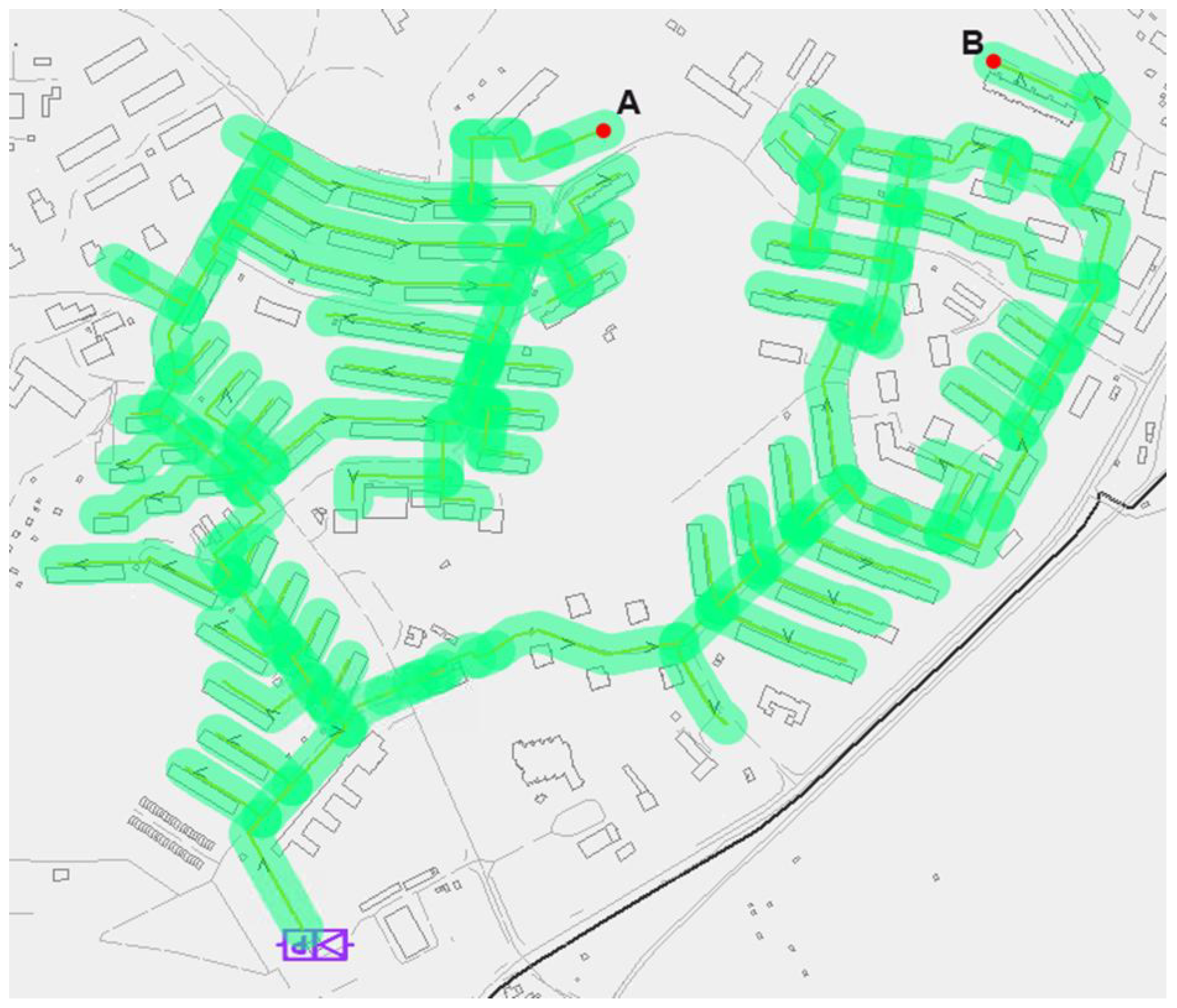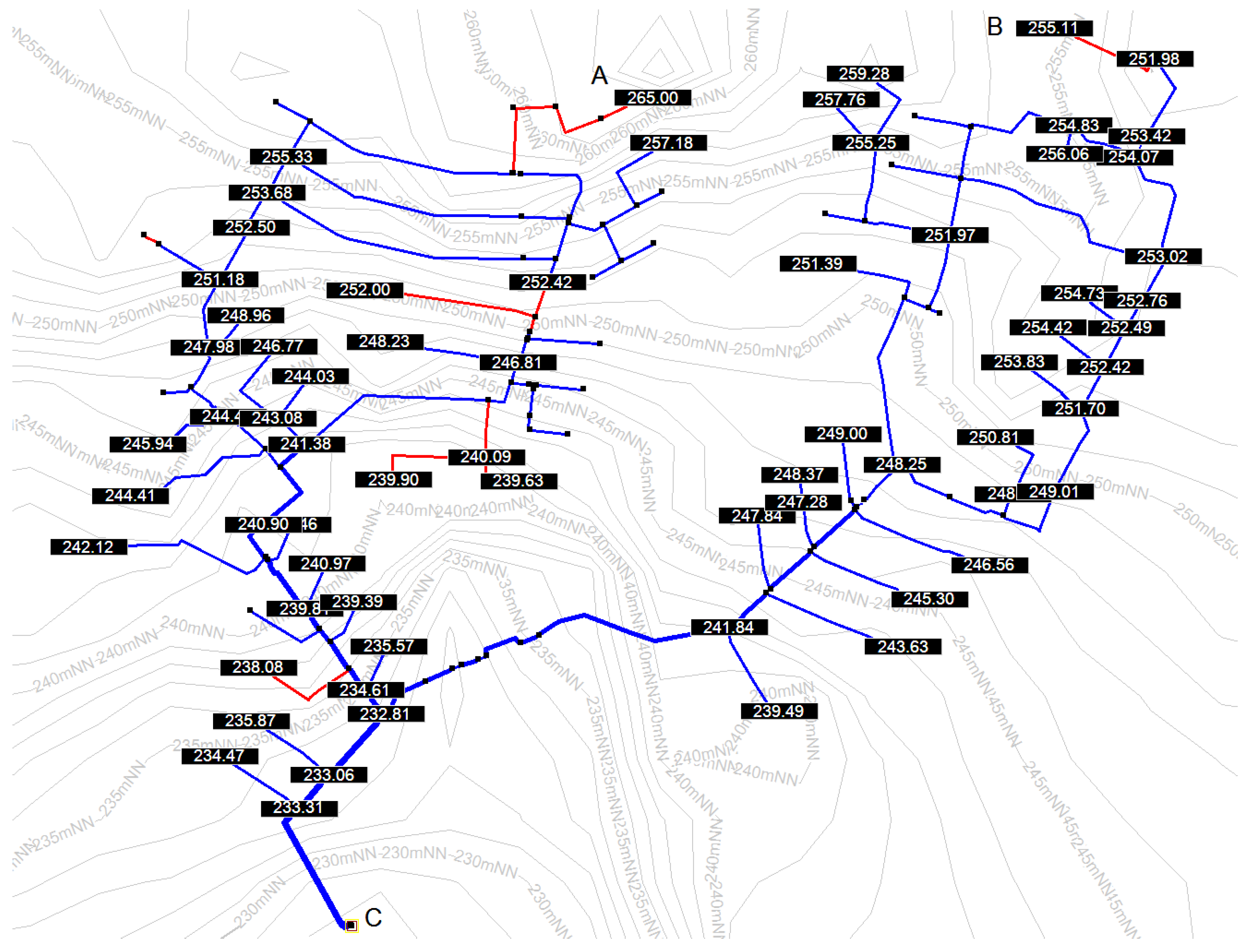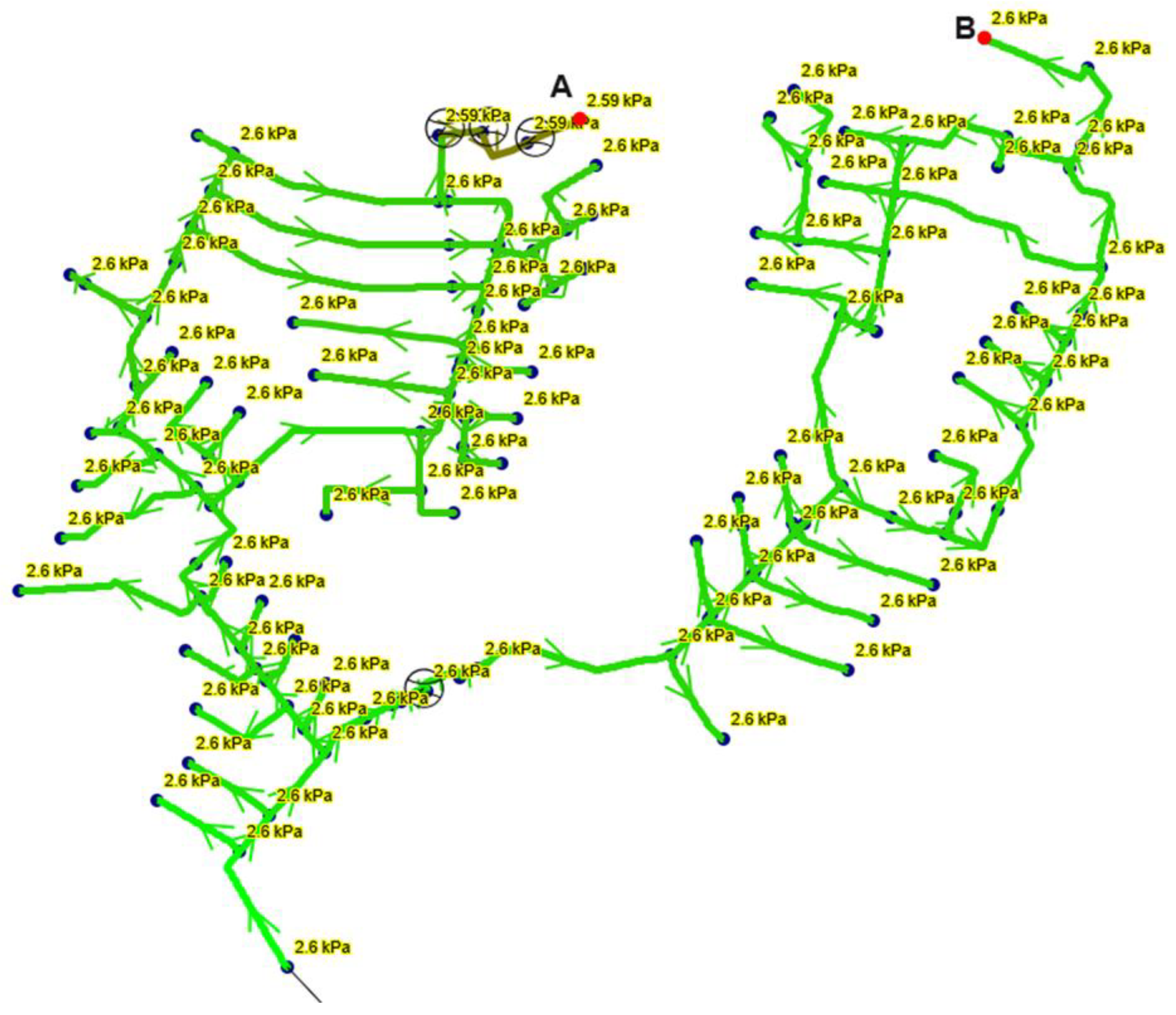 - Point B—the most distant consumption point from the pressure source, located at an elevation of 255.0 m and approximately 1400 m from the gas station.