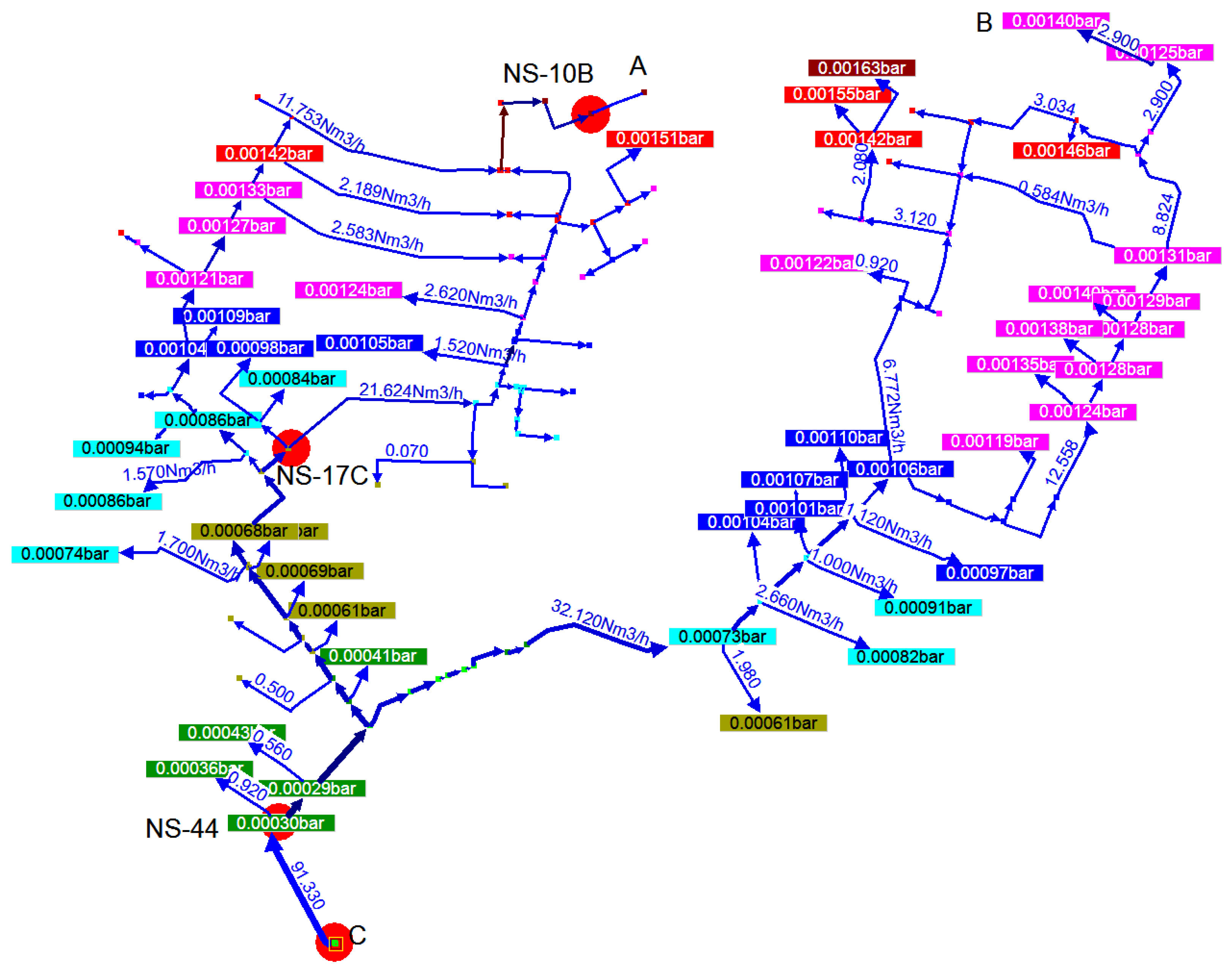 - Point A—the point with the highest elevation difference relative to the pressure source, located at 265.0 m above sea level, resulting in a height difference of 38.0 m. This point is approximately 1100 m away from the gas station along the gas flow path.