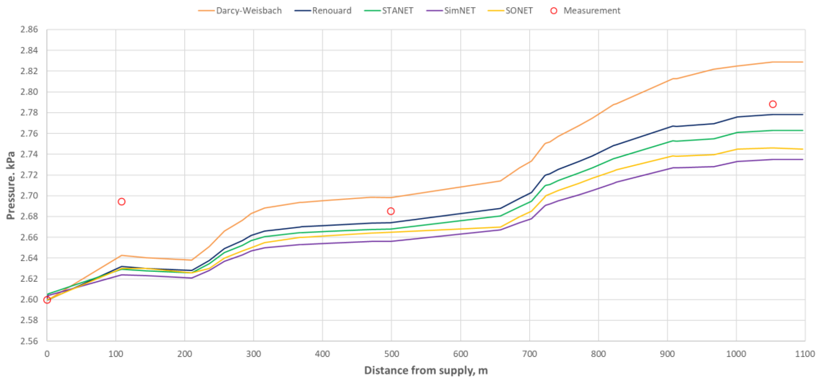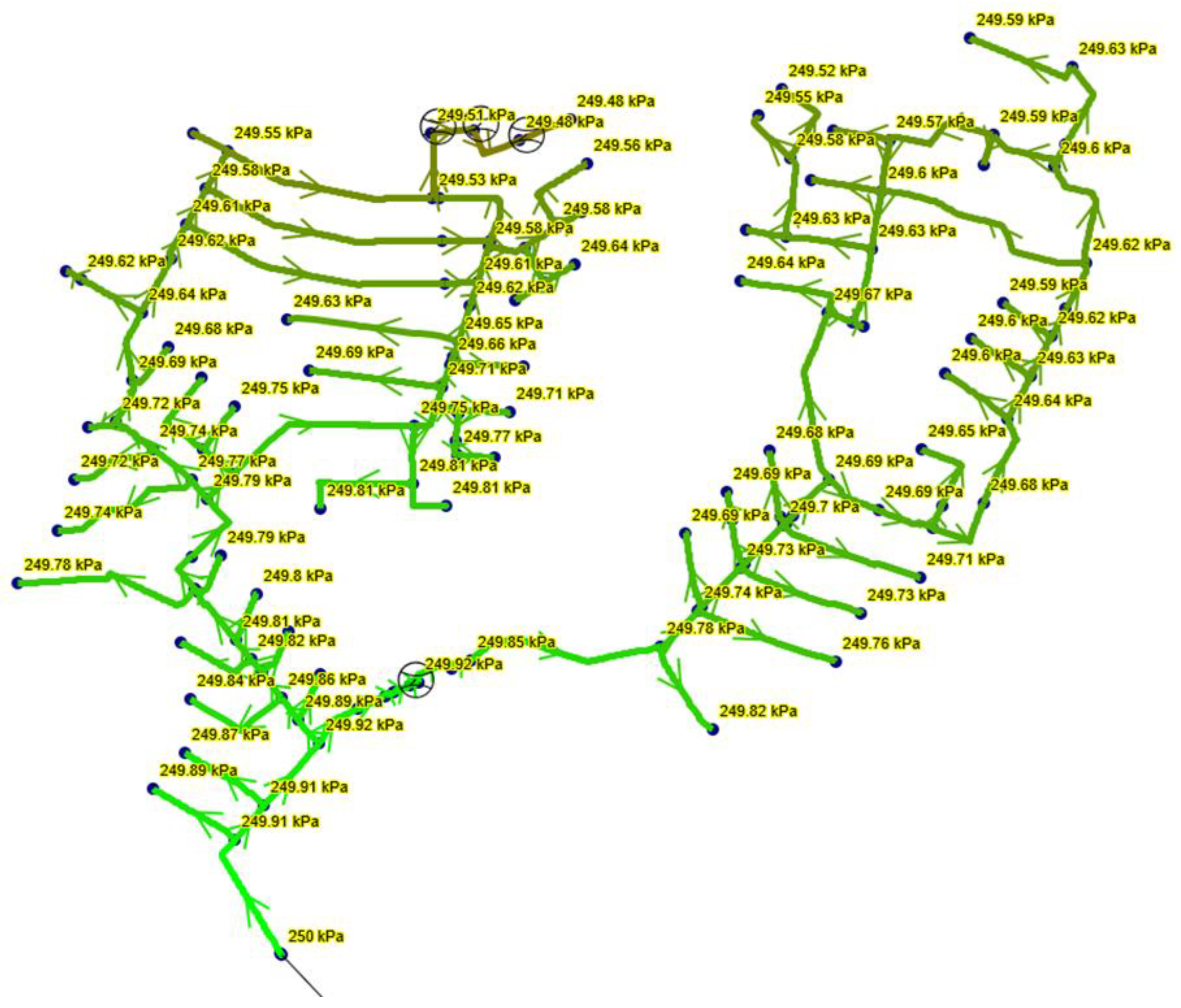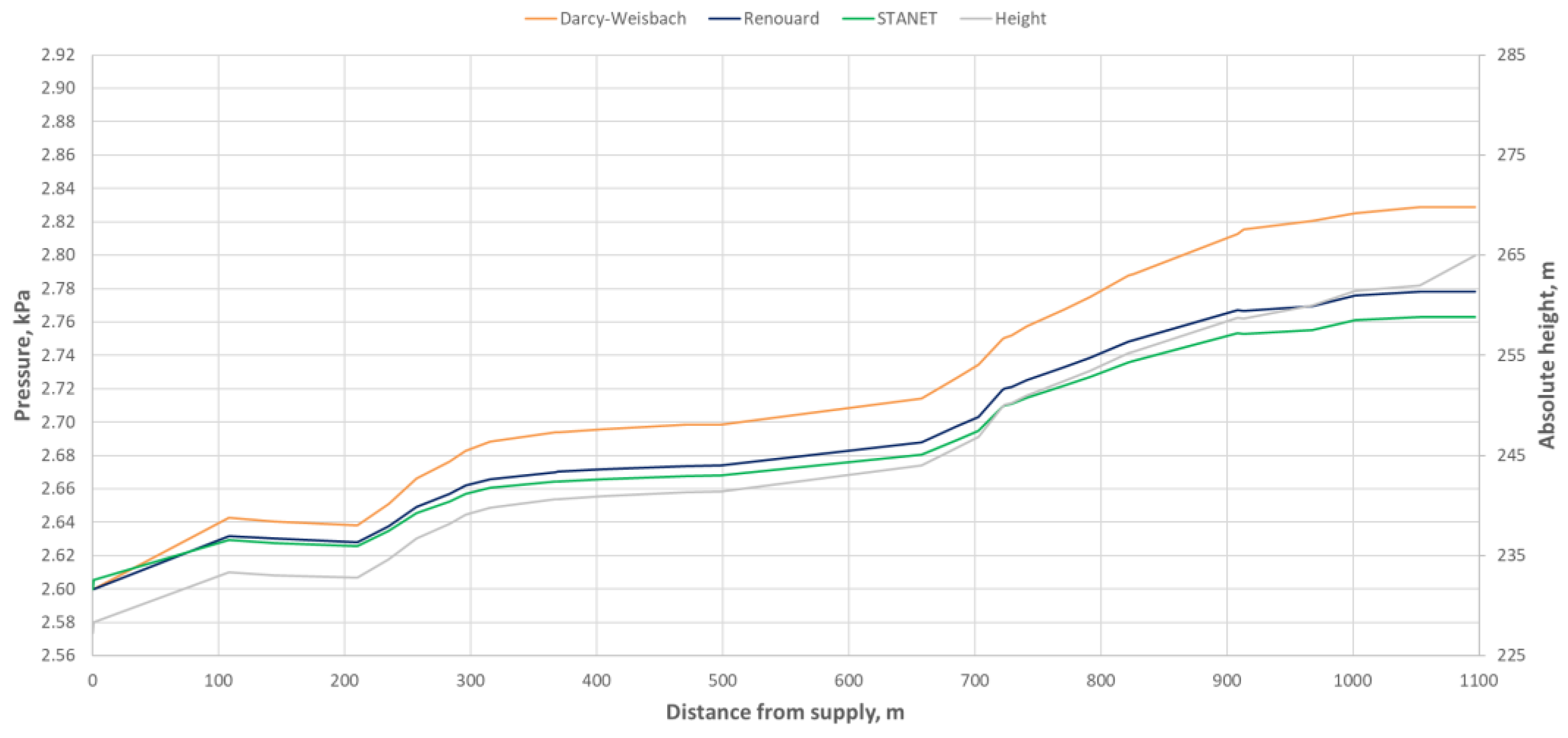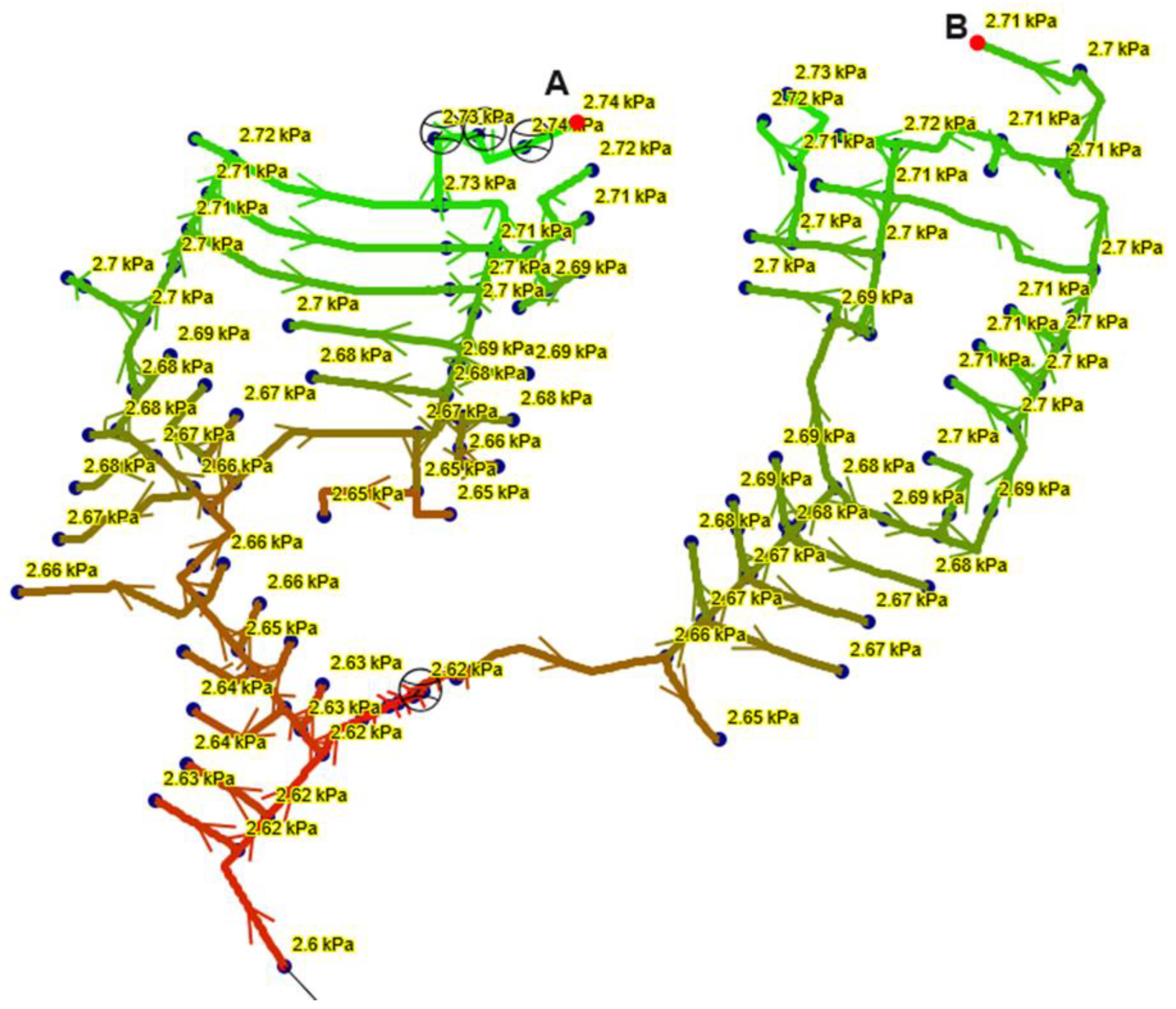 - In low-pressure networks, pressure recovery does occur. Under conditions of low linear pressure losses resulting from gas flow, this can lead to increased pressure in sections of the network located farther from the supply node. A necessary condition is an appropriate network configuration, specifically an increase in node elevation with increasing distance from the supply point.