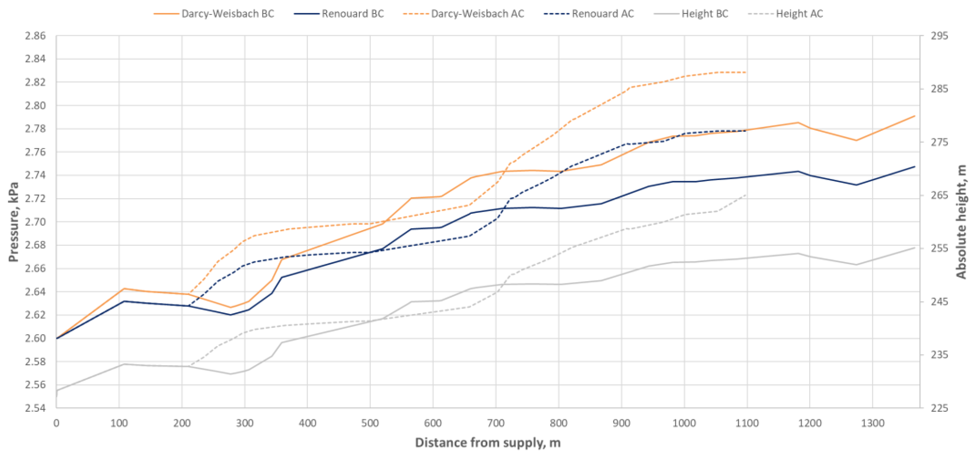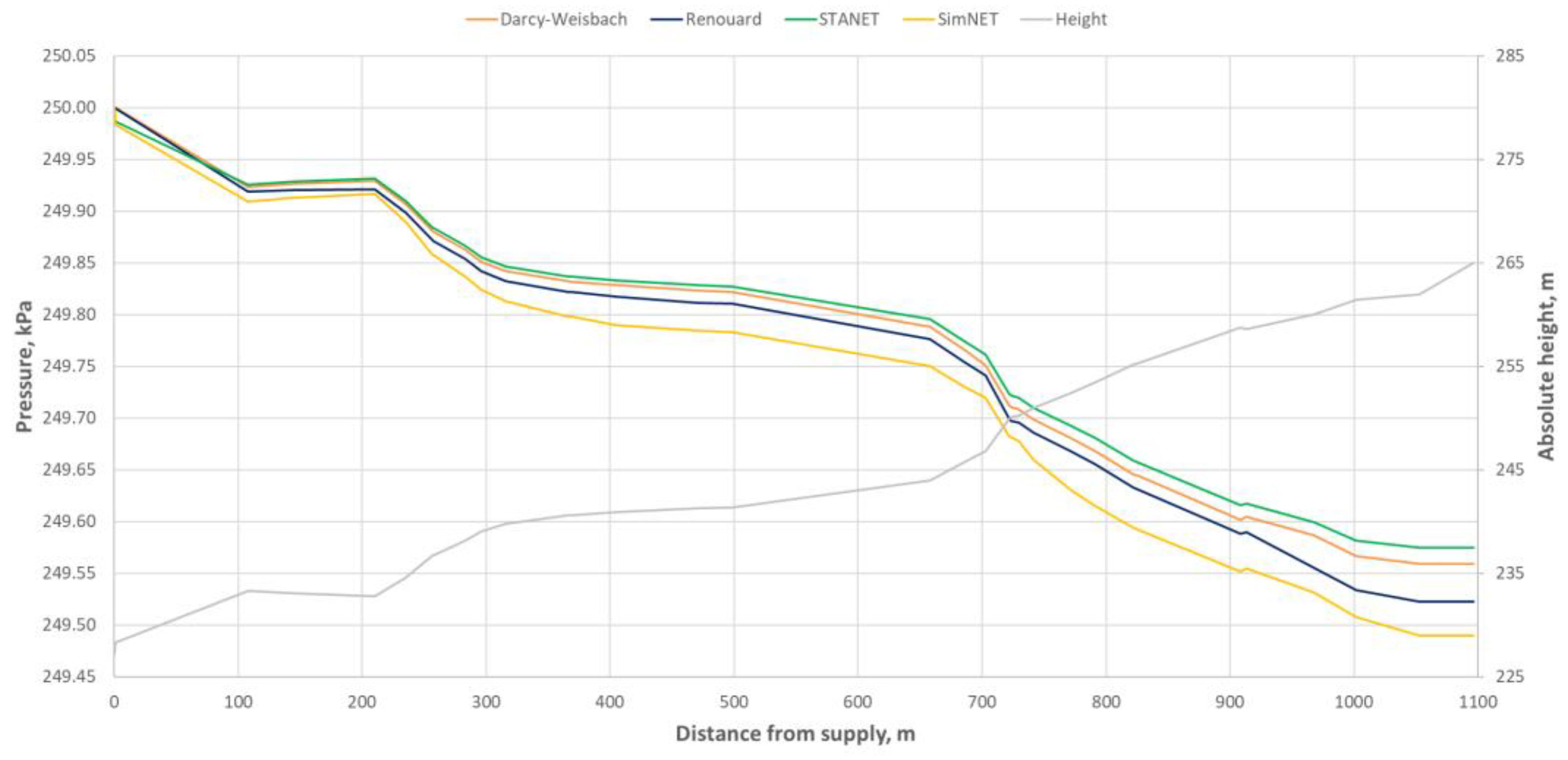 - In medium-pressure networks, pressure recovery does not occur, even when node elevations increase significantly. Moreover, comparing results from the flat model and the elevation-aware model reveals that pressure drops are noticeably greater in the elevation model. This is due to the much higher actual gas density under typical operating conditions in medium-pressure networks, where the gas becomes heavier than the surrounding air. As a result, one of the key conditions for pressure recovery is no longer met.
