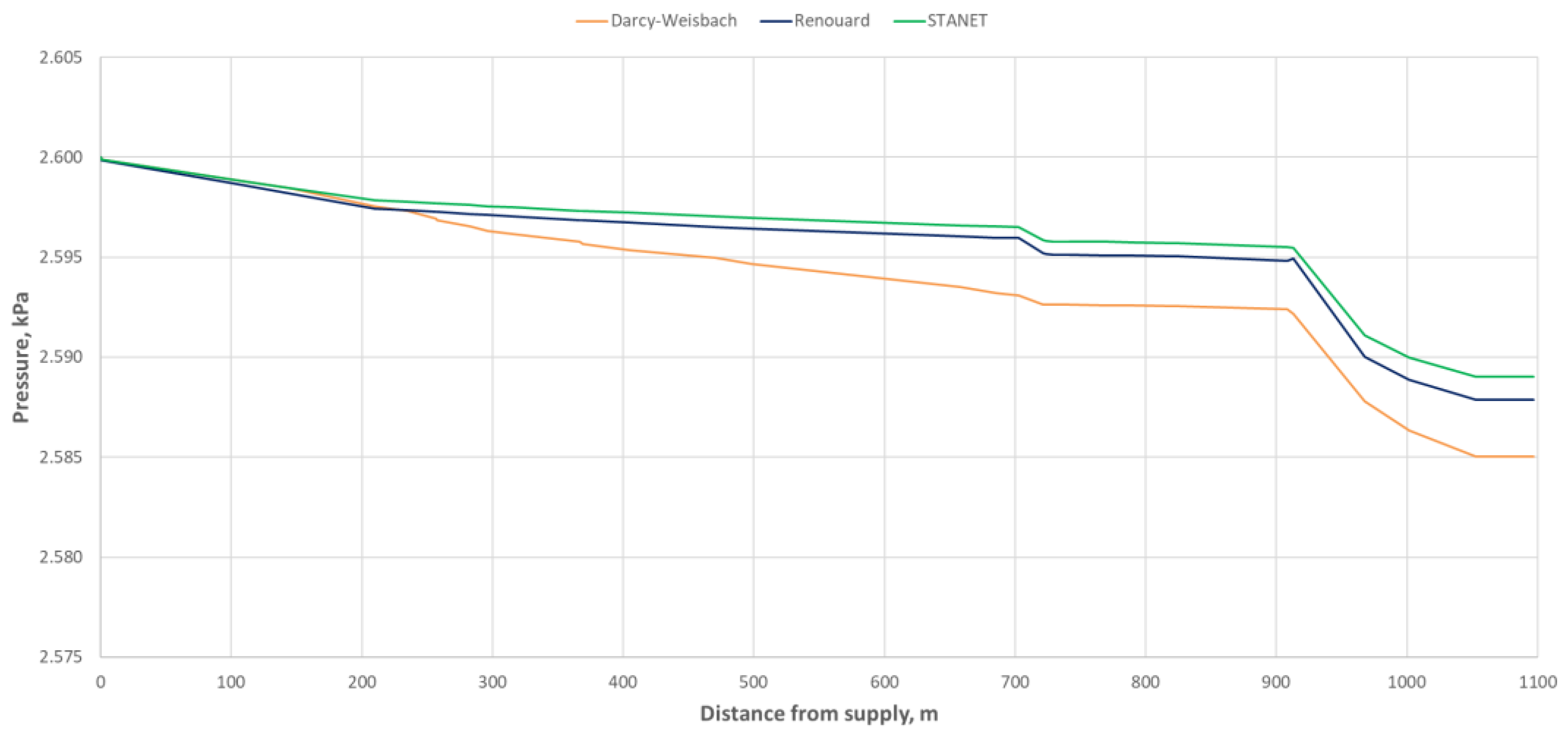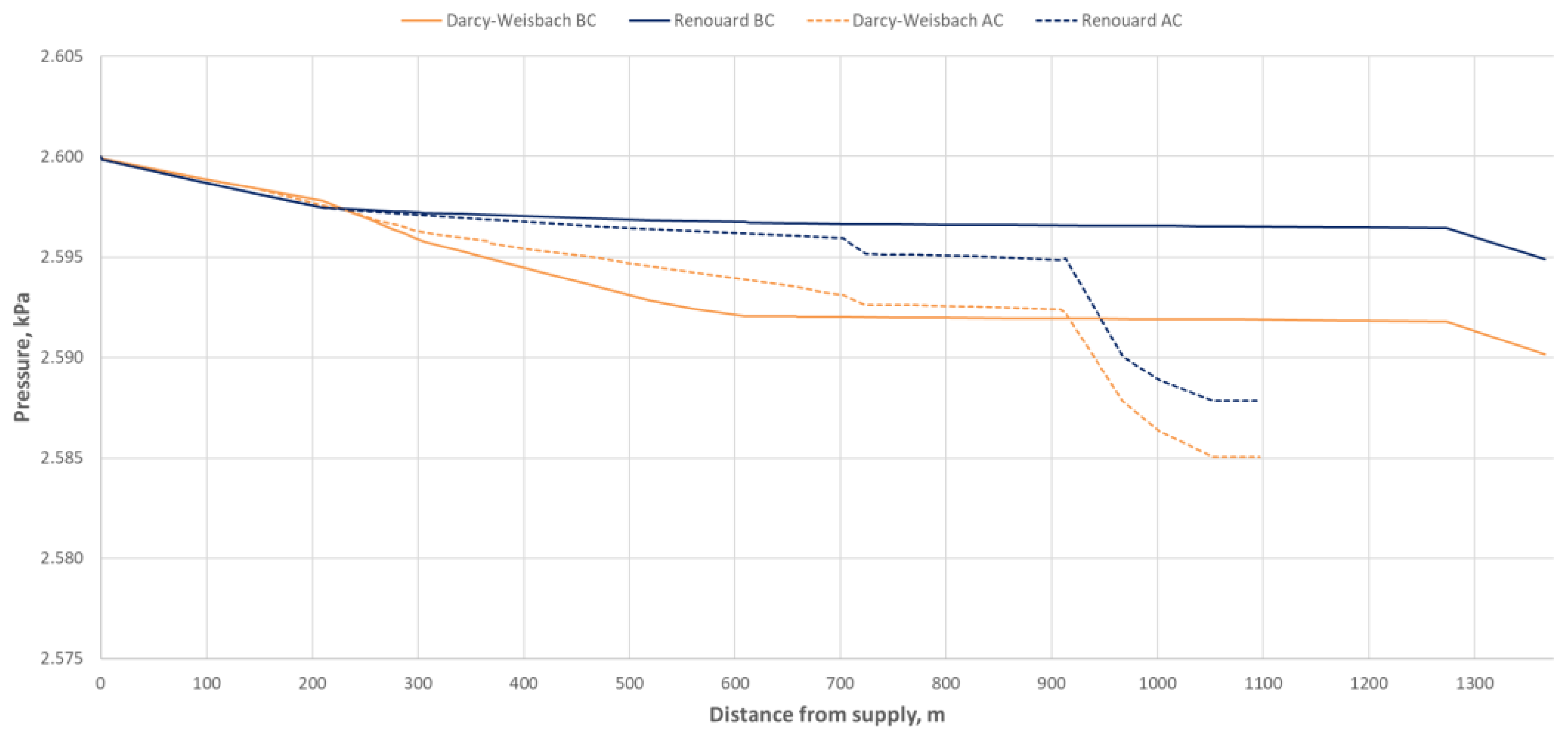 - Point B: 2.590 kPa (Darcy-Weisbach), 2.595 kPa (Renouard).
