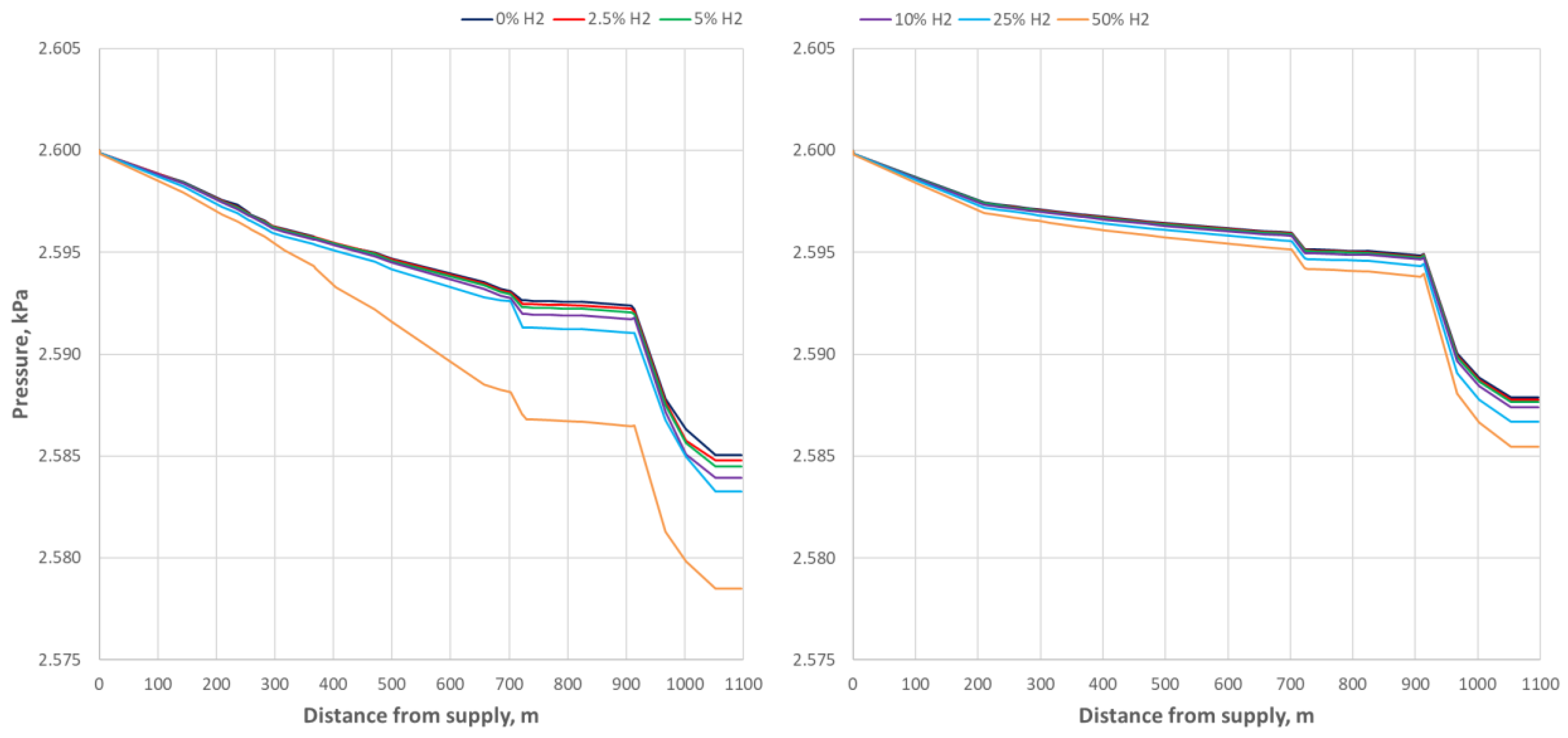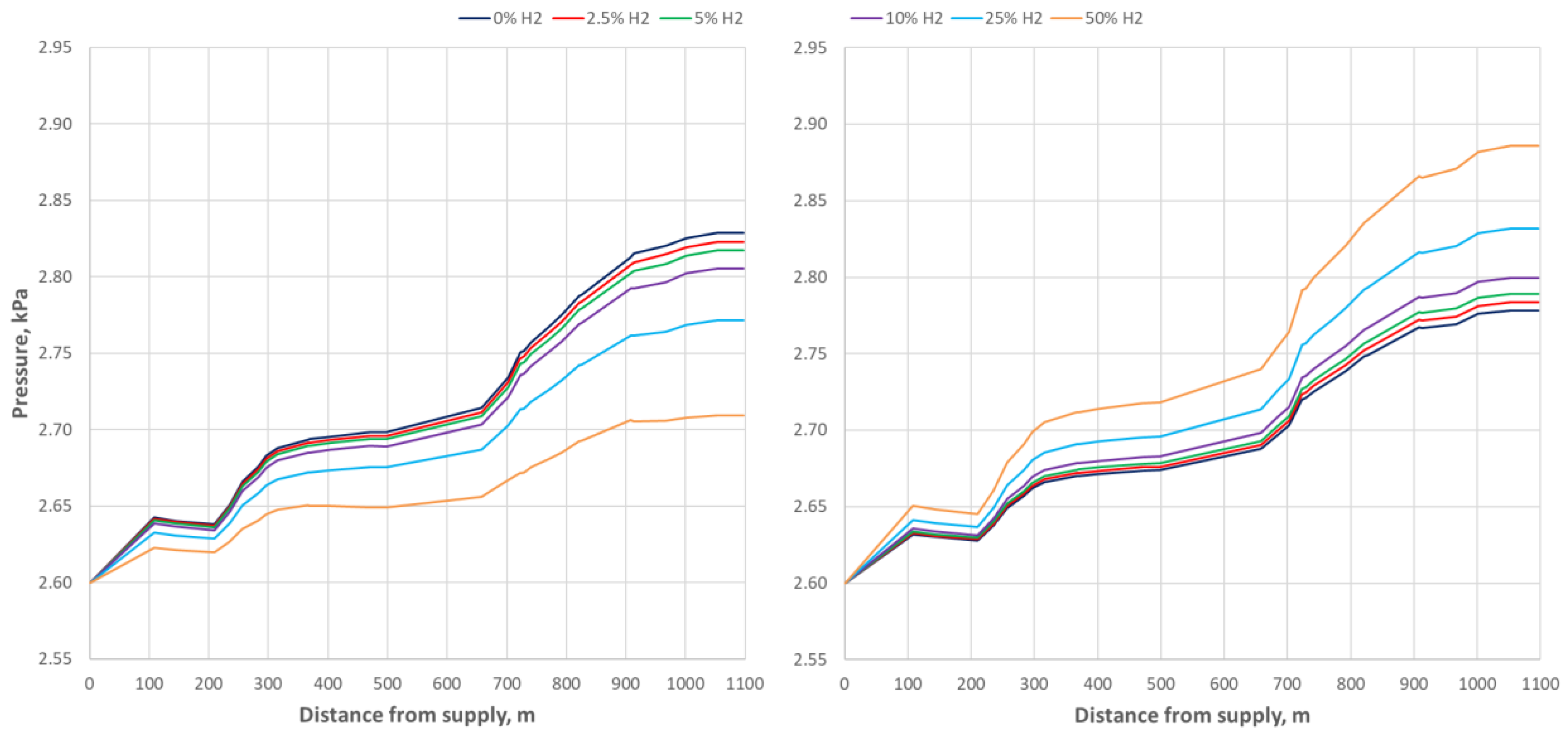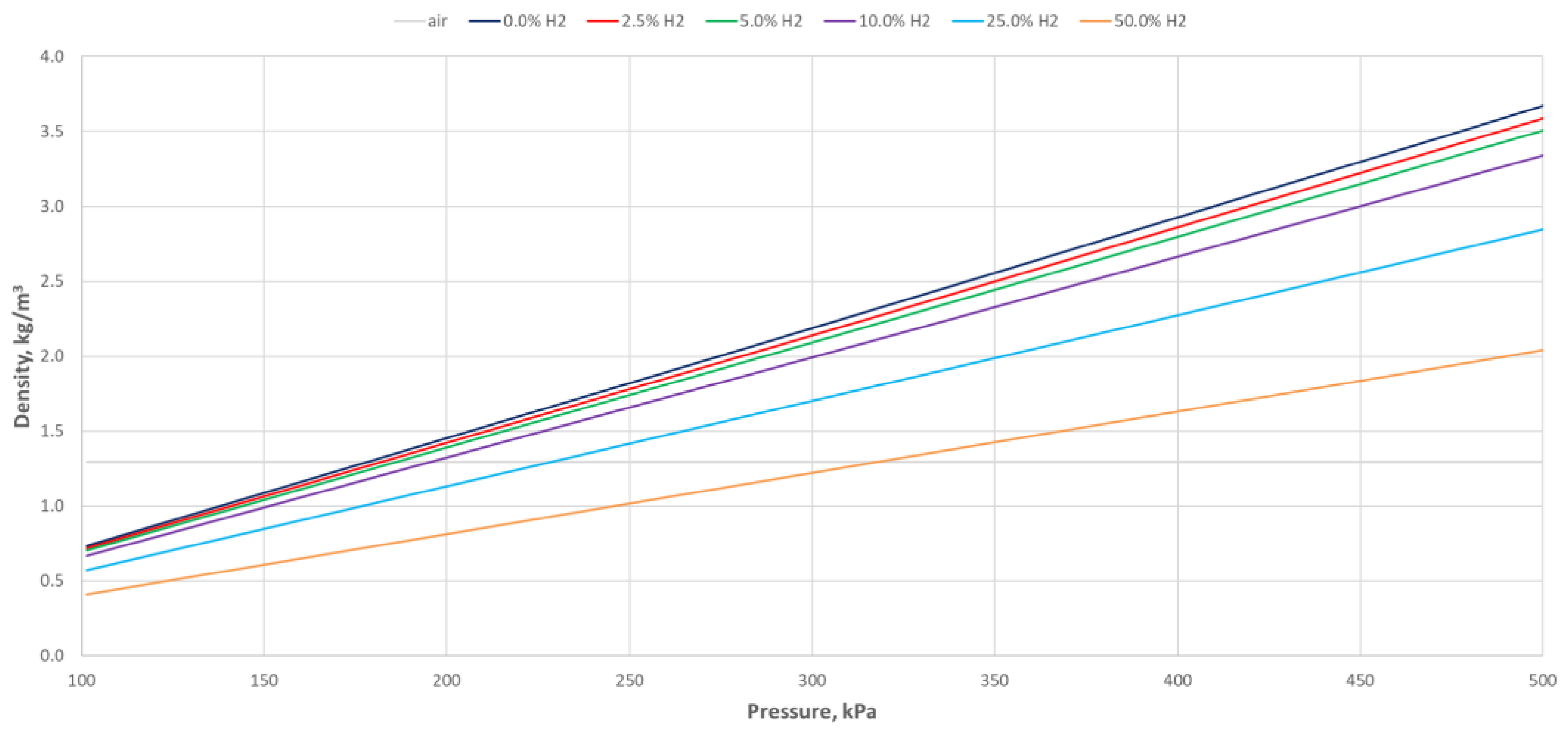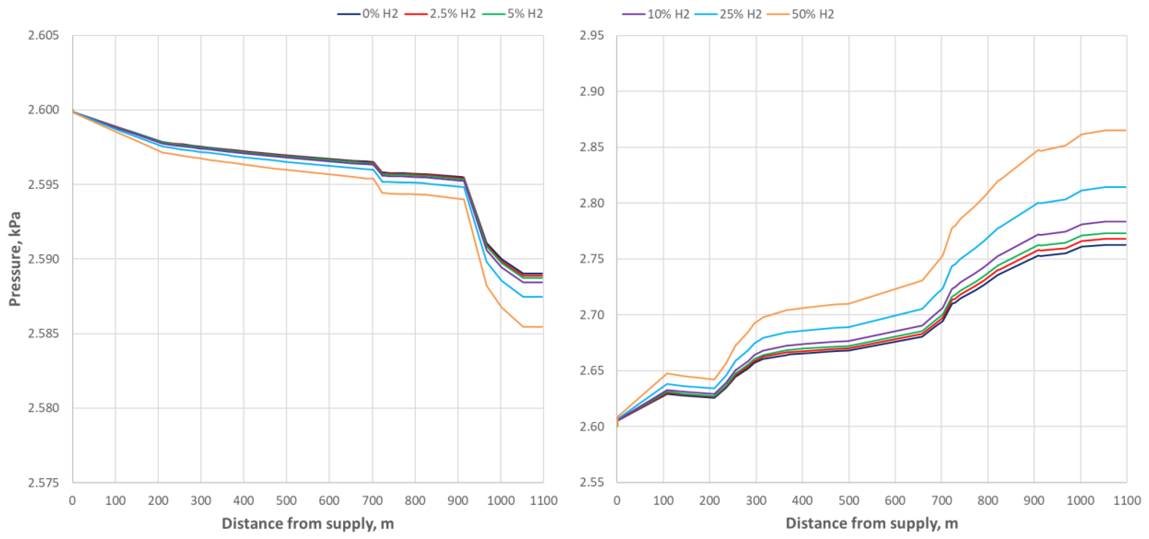 - Blending hydrogen with natural gas further reduces the density of the gas mixture, which enhances pressure recovery in low-pressure networks.