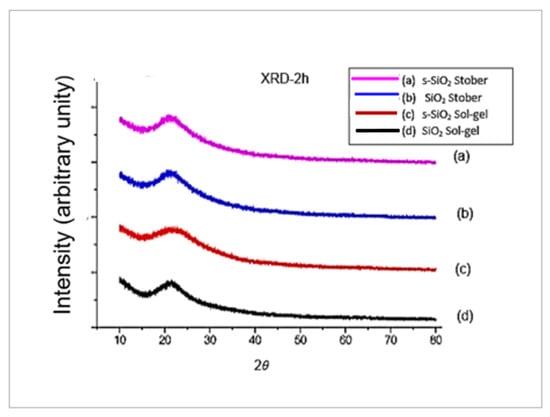 XRD patterns after calcination for 2 h: (a) s-SiO2—Stober; (b) SiO2—Stober; (c) s-SiO2—sol–gel; and (d) SiO2—sol–gel.
