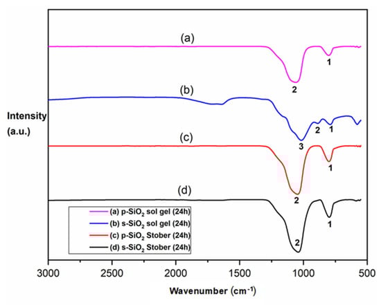 FTIR results for different silica nanoparticles after calcination for 2 h: (a) s-SiO2—Stober; (b) SiO2—Stober; (c) s-SiO2—sol–gel; (d) and s-SiO2—sol–gel.