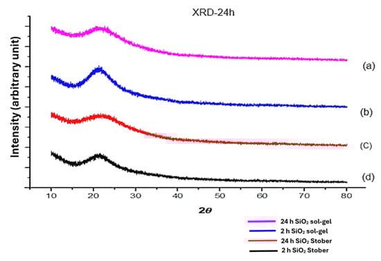 X-ray diffraction patterns for silica particles calcinated for 2 h (b,d) versus 24 h (a,c): (a) p-SiO2—sol–gel; (b) s-SiO2—sol–gel; (c) p-SiO2—Stober; and (d) s-SiO2—Stober.