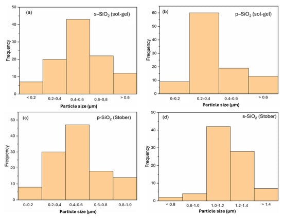 Using ImageJ2 software, the average particle sizes were found to be 0.5 µm, 0.3 µm, 0.6 µm, and 1.2 µm, respectively, for s-SiO2—sol–gel; p-SiO2—sol–gel; p-SiO2—Stober; and s-SiO2—Stober. The respective silica particle size distributions are shown in Figure 8. For the sol–gel-synthesised silica particles, only a slight difference in the particle sizes is observed between the sulfonated and pristine counterparts. This trend is different for the silica particles synthesised using the Stober method, where the sulfonated particles are significantly larger (1.2 µm) than the pristine silica ones (0.6 µm). This observed difference in particle size in the p- and s-Stober silica may arise because of sulfonation. The additional sulfonic acid layer on the silica particles, and their increased interactions, results in increased particles. However, the same silica samples do not show a big deviation in particle size when calcinated for 2 h due to the presence of impurities, which equally affect both the s- and p-silica. This means that the impurity effects are more dominant than the sulfonation effect with shorter calcination times (2 h). Compared to the silica particles calcinated for 2 h (Section 3.3), there are variations in particle size with the ones calcinated for 24 h for both the sol–gel- and Stober-synthesised silica. There is a trend of a reduction in particle size with increasing calcination time. This trend may be attributed to the effects of the complete removal of impurities with longer calcination times (24 h).