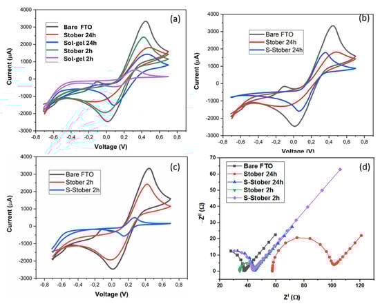 Cyclic voltammograms of (a) bare FTO and SiO2 particles prepared by the Stober and sol–gel methods (b,c) and p-SiO2 and s-SiO2 particles prepared by the Stober method over 2 and 24 h. (d) Nyquist plot of p-SiO2 and s-SiO2 particles prepared by the Stober method.