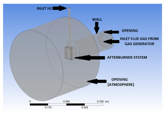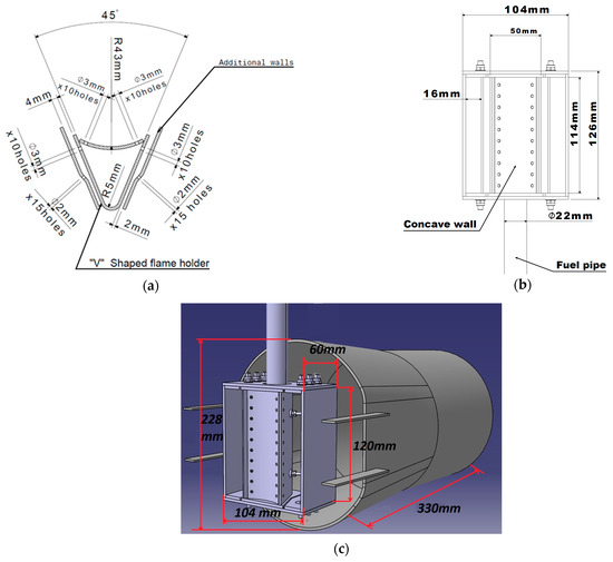 The geometry of the model studied in this article is based on the CH4 functioning afterburner configuration presented previously [20] (Figure 1). A new flame holder was developed capable of using pure hydrogen as fuel. The afterburner system consists of a casing and the flame holder assembly. The flame is stabilized by means of a V-shaped flame holder, positioned in the gas generator exhaust flow. An enclosure through which the fuel is delivered has been created by adding a concave wall to the original V-shaped flame holder. The flame holder has 40 holes of Ø3 mm that allow the fuel to exit the enclosure and be injected in the flue gas stream. To further encourage the flue gas coming from the gas generator to flow around the flame holder, additional walls have been placed on the sides of the V-shaped enclosure. The proposed flame holder geometry will facilitate the proper mixing of the fuel with the flue gas, thus leading to its ignition. Figure 2a–c [22] provide the overall dimensions of the studied flame holder.