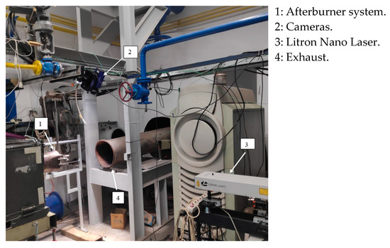 The investigated afterburner system, developed and manufactured in COMOTI, has been positioned downstream of a Garrett 30–67 gas turbine engine, which was used as a gas generator. The experimental setup and testing rig are described in detail [22]. A Particle Image Velocimetry (PIV) system was employed to assess the velocity downstream of the afterburner’s flame holder.