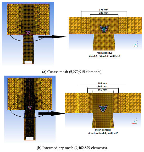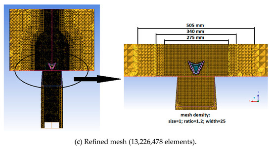 The computational domain’s geometry has been constructed to match the experimental model, facilitating the comparison between the numerical results and the experimental findings. The computational domain (Figure 5) starts from the gas generator outlet, includes the afterburner system presented in Section 2.1, and extends 500 mm downstream of the flame holder. In the transversal direction, the extension measures 350 mm, centered on the afterburner symmetry axis. The discretization of the computational domain has been performed using ICEM CFD. Three unstructured type computational grids have been generated (Figure 6a–c).