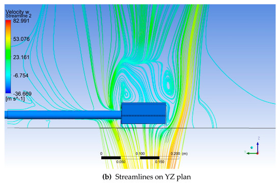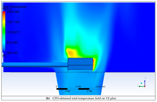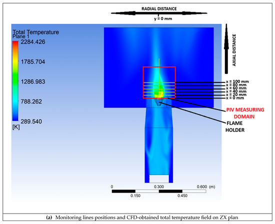 Figure 9a,b present the Total Temperature field on two perpendicular longitudinal planes through the computational domain. The yellow lines in Figure 9a, downstream of the flame holder, represent the monitoring lines along which the velocity obtained through CFD simulations is compared with the PIV measured values. The red square represents the limits of the PIV measuring domain. Figure 10a,b present the streamlines on the same two perpendicular longitudinal planes through the computational domain. From Figure 9 and Figure 10, it can be observed that the flame holder fulfills its role. Ignition occurs and the flame is attached to the flame holder. Also, downstream of the flame holder, vortices and high turbulence levels develop. These vortices facilitate the mixing of hydrogen with the flue gas produced by the gas generator. The asymmetry of the flame can be explained by the fact that the flue gas coming from the gas generator does not exit axially.