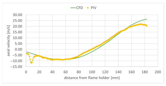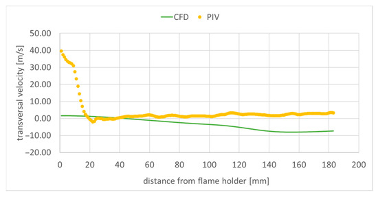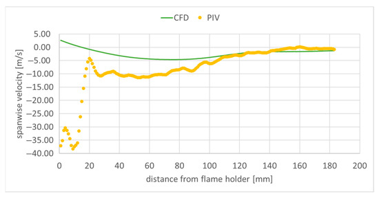 The recirculation zone generated by the flame holder in the flow measures approximately 100 mm, with the peak negative velocity reaching around 10 m/s (Figure 12). The far-field free stream velocity is about 20 m/s. The remaining two velocity profiles are much smaller on the central domain axis both in the experimental measurements, and in the numerical simulation (Figure 13 and Figure 14), as the main flow at the centerline is primarily axial. The differences between the PIV measured velocities, and the numerical results observed in Figure 12, Figure 13 and Figure 14 for distances from the flame holder smaller than 20 mm, can be explained by the diminished measurement accuracy in that region, as it is close to the edge of the experimental field. In the case of the axial velocity component (Figure 12), the obtained numerical results are in reasonable agreement, for a RANS simulation, with the experimental data. The transversal velocity component (Figure 13) is underestimated by the numerical simulation. In the case of the spanwise velocity component (Figure 14), the results obtained are very similar to the measured data for distances downstream from the flame holder greater than 100 mm.