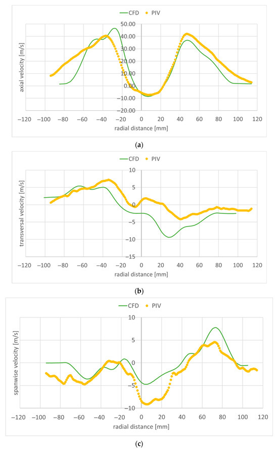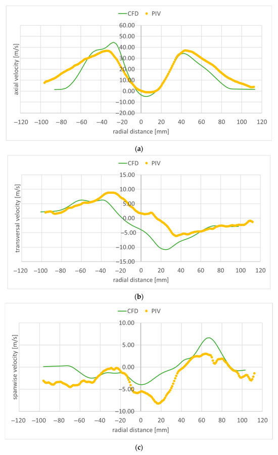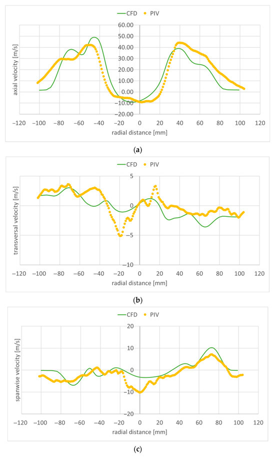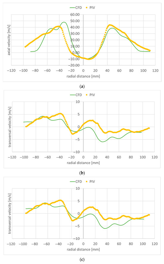 Figure 15, Figure 16, Figure 17, Figure 18 and Figure 19 present the velocity profile components along transversal lines situated at 20 mm, 40 mm, 60 mm, 80 mm, and 100 mm downstream of the flame holder. The PIV measured axial velocity component profiles capture the recirculation region well, where the velocity values become negative. Beyond the recirculation region, the free stream reaches an experimentally measured value of approximatively 40 m/s at 20 mm downstream from the flame holder (Figure 15a), and 35 m/s at 100 mm downstream of the flame holder (Figure 19a). As the exhaust jet interacts with the surrounding air and moves away from the centerline, its axial velocity decreases and the jet spreads out more. As the monitoring line moves further downstream from the flame holder, both the intensity and the width of the recirculation region diminish owing to the decreasing difference between the axial velocities behind the flame holder and the flow around it. The RANS numerical simulation also captures the recirculation region and velocity well, but slightly overpredicts the free stream velocity: 50 m/s at 20 mm downstream from the flame holder (Figure 15a), and 45 m/s at 100 mm downstream of the flame holder (Figure 19a). Also, the width of the recirculation zone is slightly underestimated. A slight asymmetry can be observed both at the experimental and numerical axial velocity component profiles. This is due to the imperfections of the flue gas flow coming from the gas generator. The flue gas flow is not axial; it leaves the gas generator rotated. The remaining two velocity component profiles are much smaller; as mentioned before, the flow is mainly axial. The transversal velocity component profiles indicate a pair of counter-rotating vortices, for distances from the flame holder greater than 60 mm, both in the numerical and experimental data. The velocity variations captured by the PIV measurements in the area right behind the flame holder (−20 < radial distance < 20) in Figure 15a–c are not found in the numerical simulation results. This could mean that the computational grid is not sufficiently refined in that area, and/or the used RANS turbulence model is not suitable for characterizing the flow in this region.