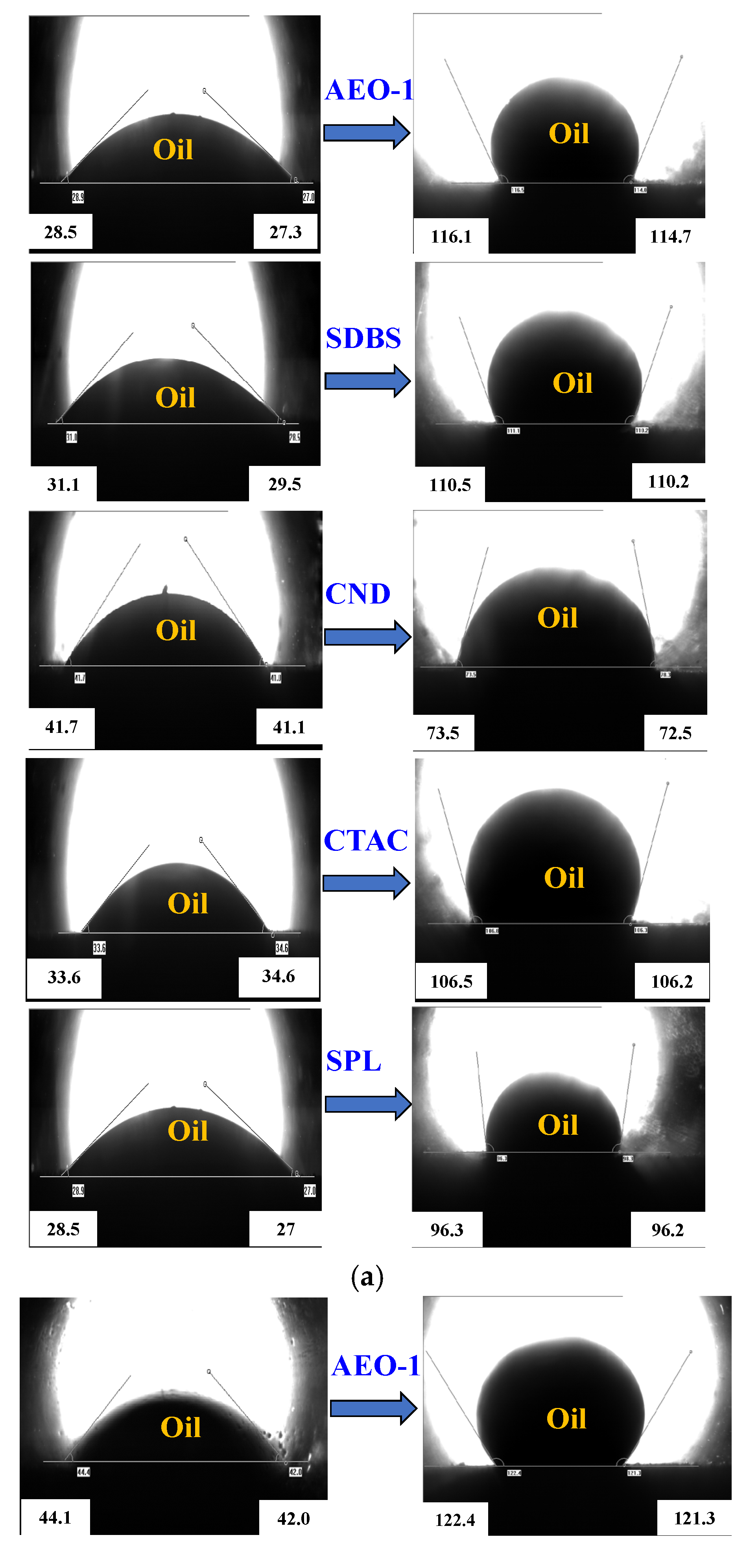 - Wang, Y.; Wang, D.; Ding, C.; Li, J.; Jiang, S. Stripping Mechanism of Surfactant System Based on Residual Oil on the Surface of Sand-Conglomerate Rocks with Different Grain Size Mineral Compositions. Molecules 2024, 29, 1278. [Google Scholar] [CrossRef]