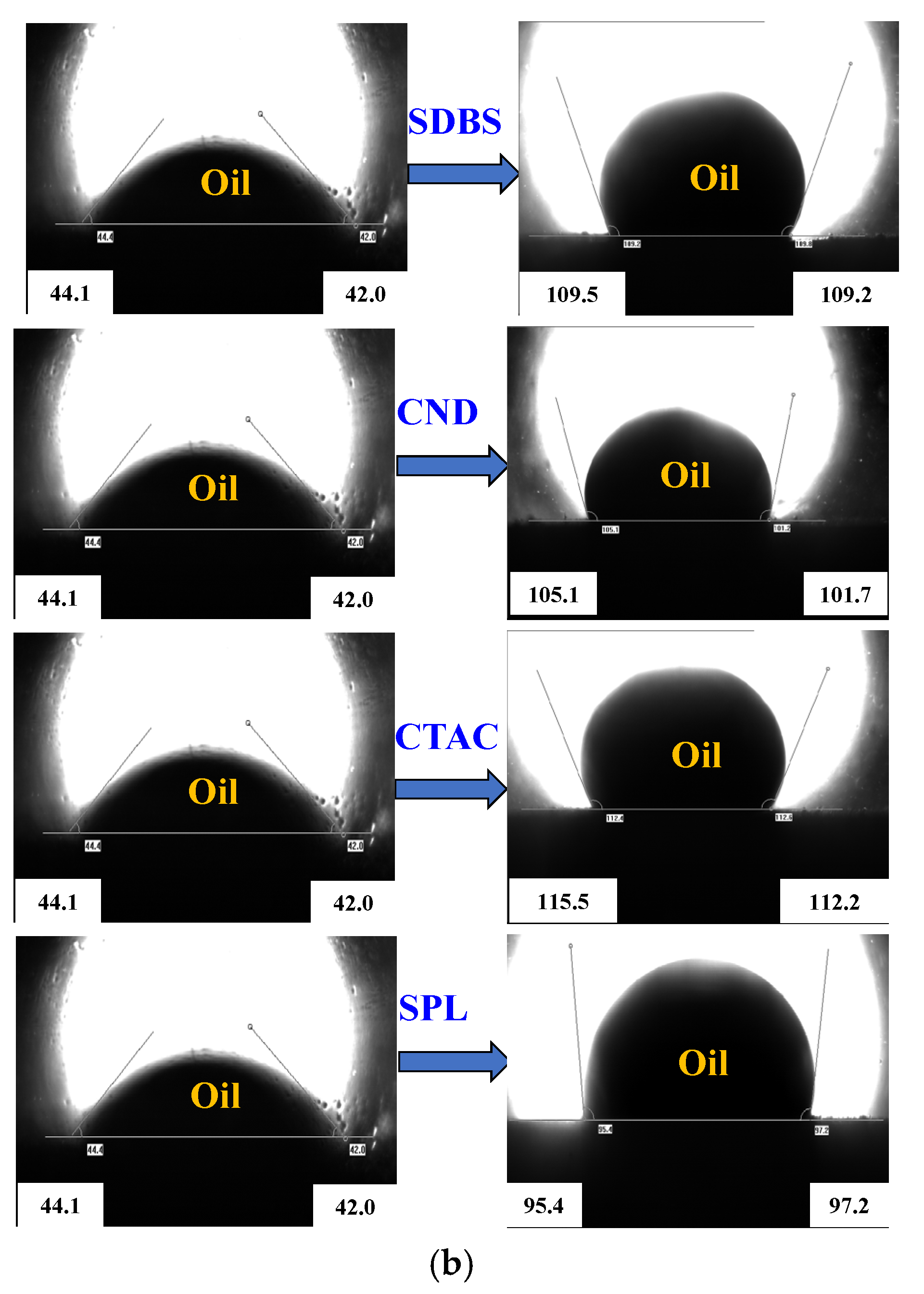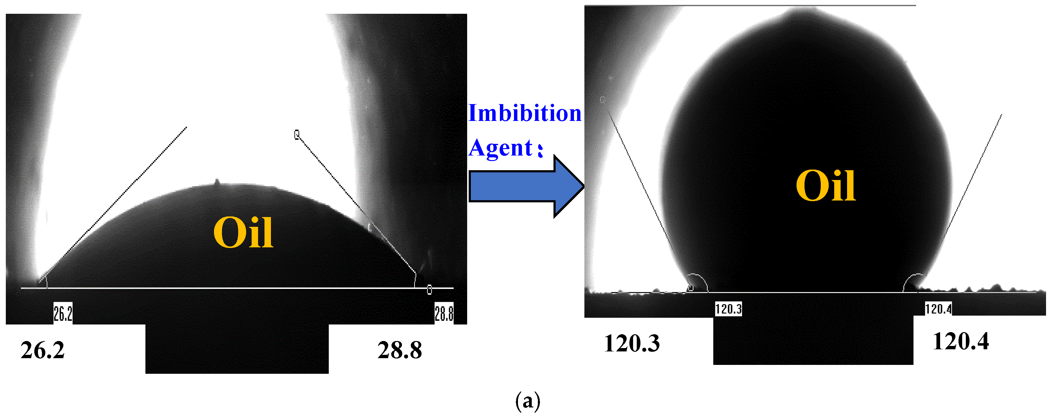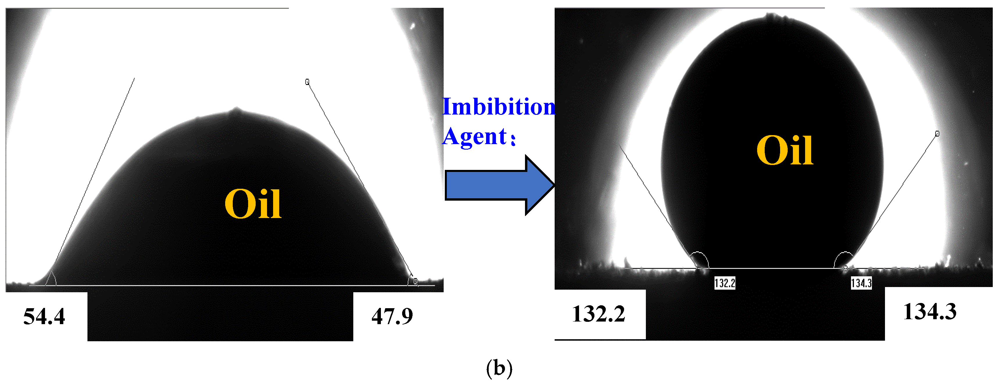 - Qu, H.; Shi, J.; Wu, M.; Zhou, F.; Zhang, J.; Peng, Y.; Yu, T.; Pan, Z. Experimental Study on the Mechanism of Enhanced Imbibition with Different Types of Surfactants in Low-Permeability Glutenite Reservoirs. Molecules 2024, 29, 5953. [Google Scholar] [CrossRef]