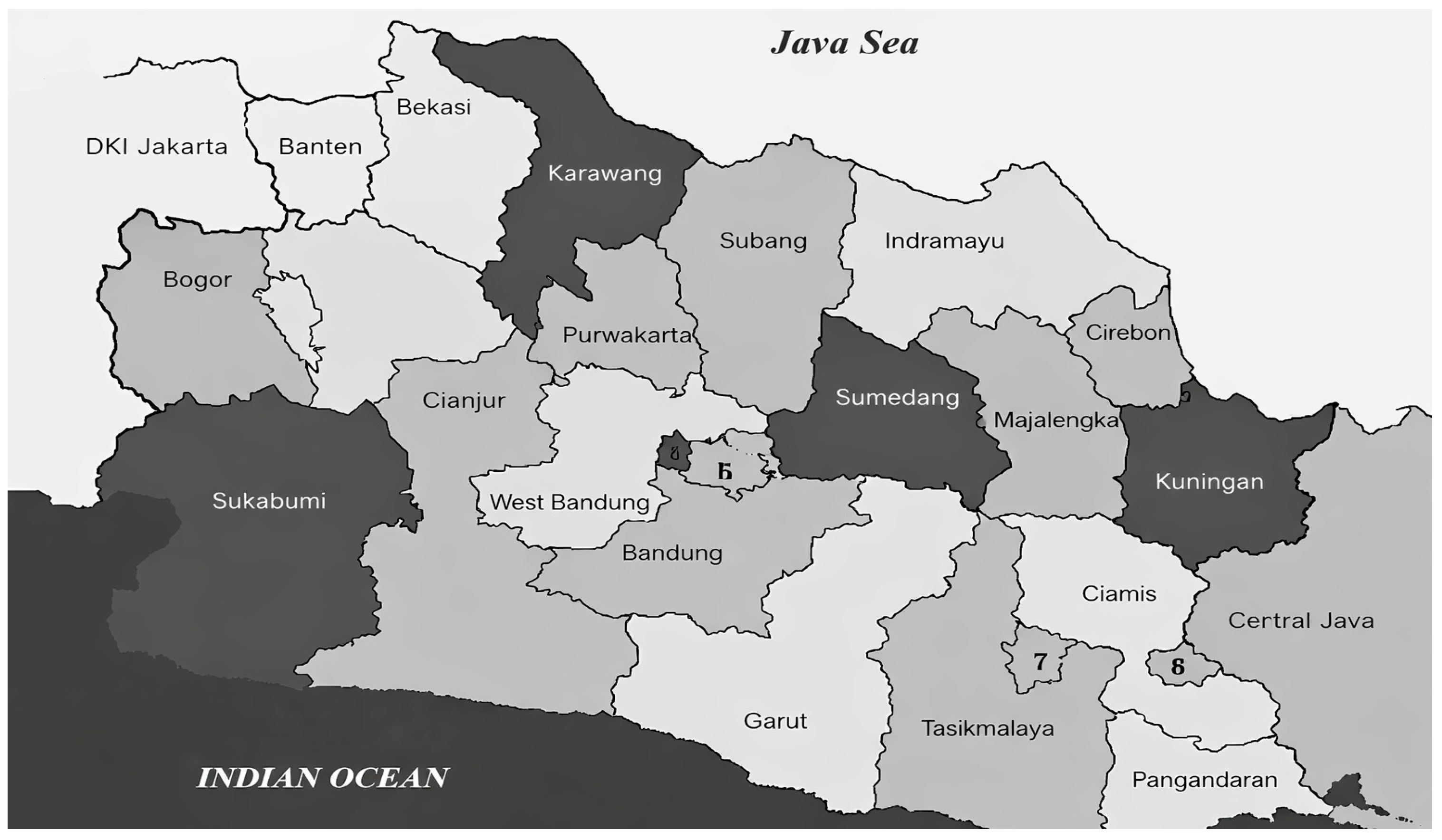 - Bappeda Provinsi Jawa Barat. West Java Provincial Spatial Planning Map (RTRW) 2024–2045: GIS-Based Thematic Maps; Government of West Java Province: Bandung, Indonesia, 2024. [Google Scholar]