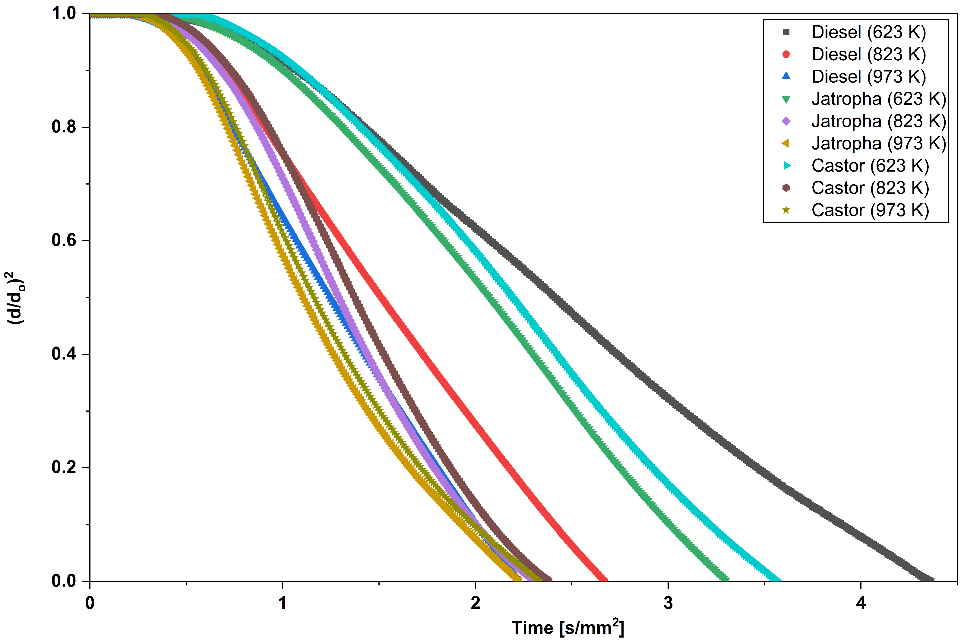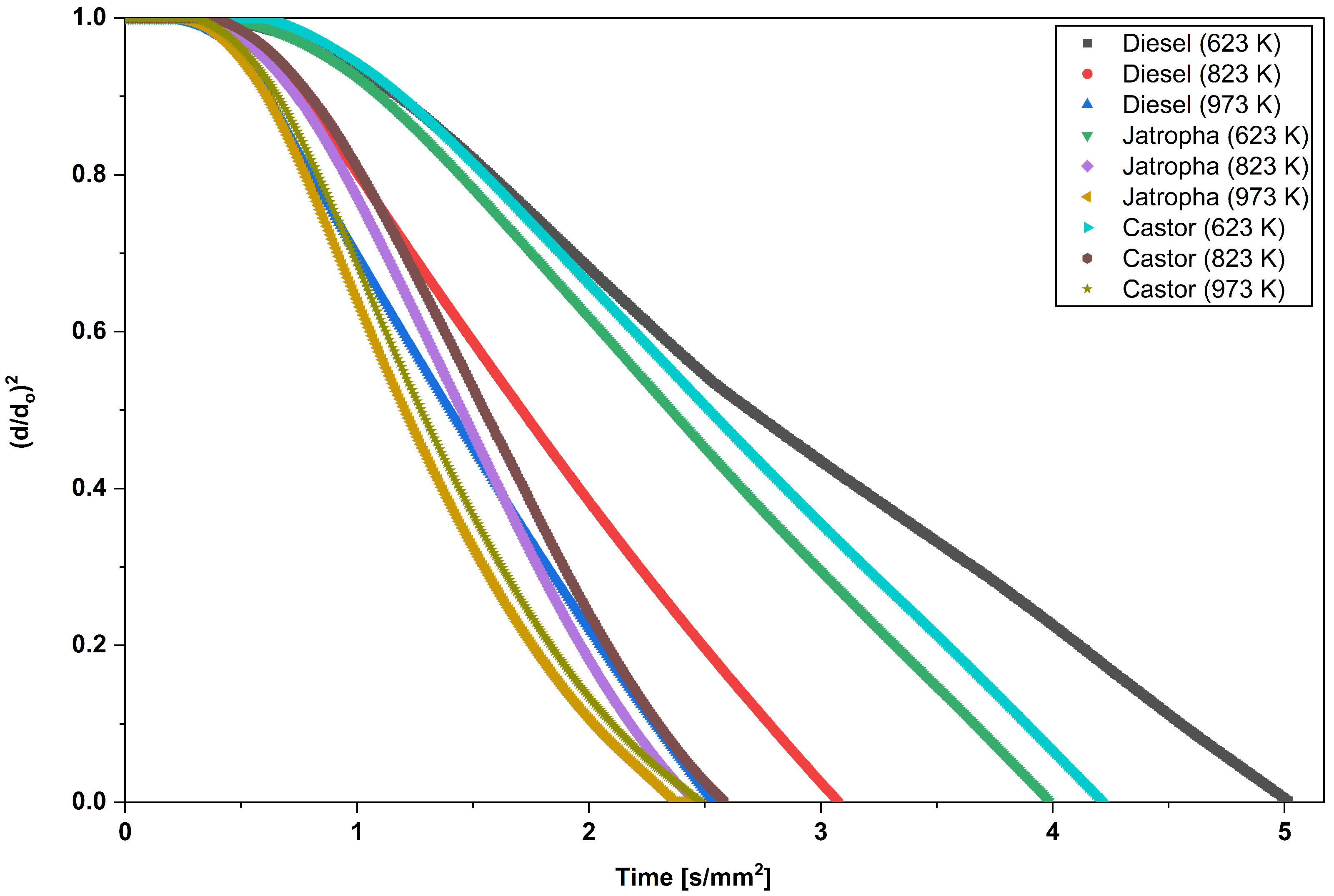 32]. After the compression stroke in the diesel engine, the temperature reaches 623 K, and during combustion, it exceeds 973 K. Thus, these three ambient temperatures are used to investigate the evaporation characteristics of diesel and biofuels.