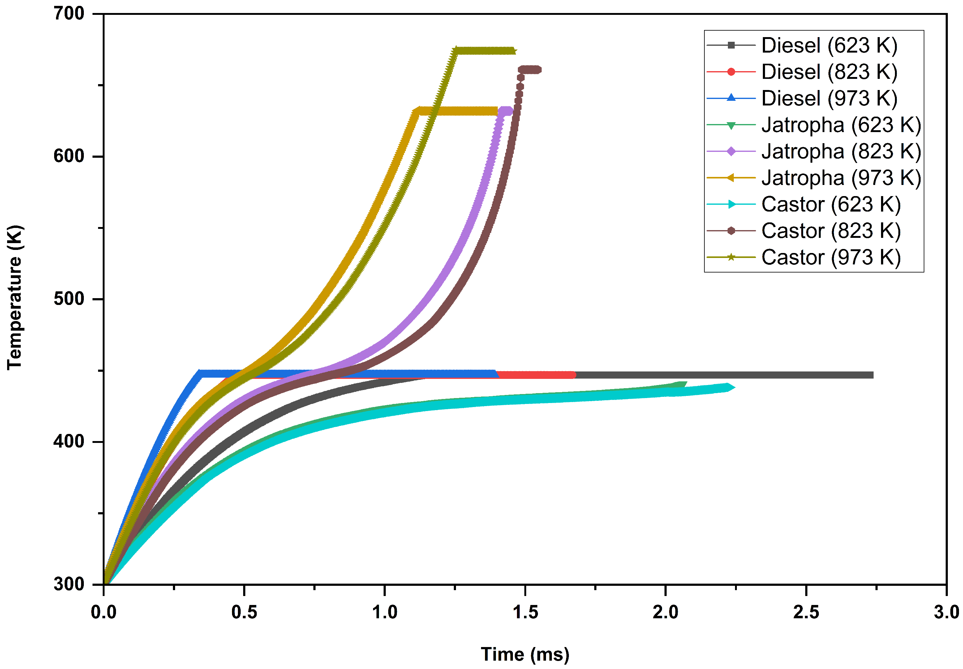 Figure 2. The maximum temperature achieved by the diesel fuel droplets is 447 K, which is also the boiling point of diesel droplets. At 623 K, diesel fuel reaches its maximum temperature at about 1 ms, while Jatropha and Castor reach the same temperature in about 1.5 ms. The residence time of Jatropha is shorter than that of both diesel and Castor fuels at 623 K. When the temperature is increased from 623 K to 823 K, the temperature profiles of biofuels change compared with those at 623 K. The diesel fuel has the same boiling point profile, with a boiling point of 447 K. However, the maximum temperature achieved by Castor and Jatropha is about 590 K. Biofuels therefore attain temperatures approximately 143 K higher than diesel fuel. This is because the vaporisation temperature and boiling point of biofuels are higher than those of diesel. It is notable that, despite their higher vaporisation and boiling temperatures, biofuels show shorter residence times than diesel in several cases. When the temperature is increased to 973 K, more heat is absorbed than at 623 K and 823 K. The maximum temperatures achieved by Castor and Jatropha biofuels are 674 K and 632 K, respectively. These values are consistent with the high ambient temperature of 973 K. Although the difference in evaporation rate between biofuels and diesel is not large at this temperature, Jatropha still shows a slightly higher evaporation rate than the other two fuels for 20-micron droplets.