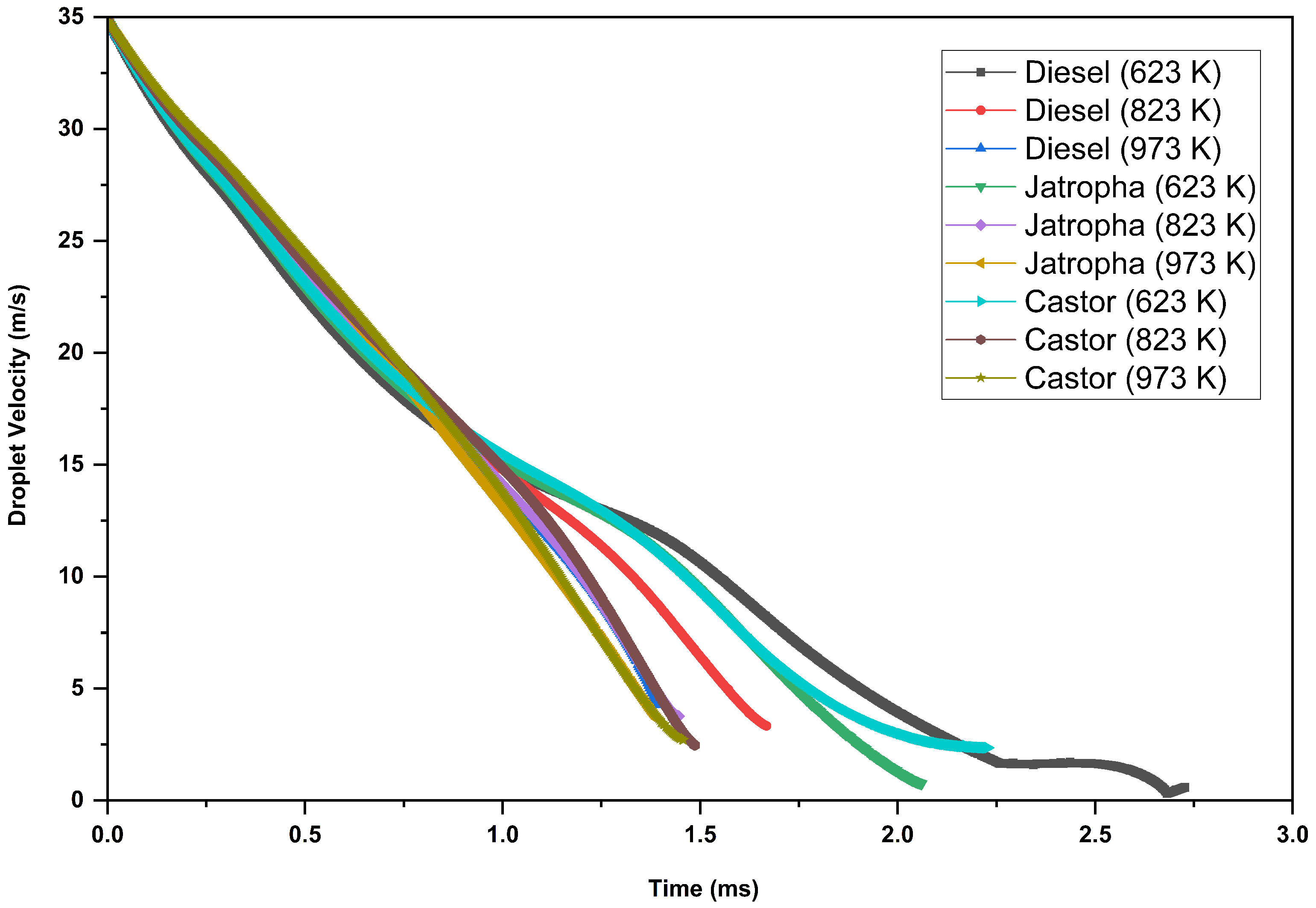 Figure 7 that, for 20-micron droplets, Castor fuel droplets have the lowest final velocities. However, for 25-micron droplets, diesel fuel droplets have the lowest final velocities. Nevertheless, Jatropha’s evaporation rate is faster than those of diesel and Castor fuels. At higher temperatures, the difference is not significant, but at 623 K, Jatropha shows a much better evaporation characteristic than diesel and Castor fuels. In