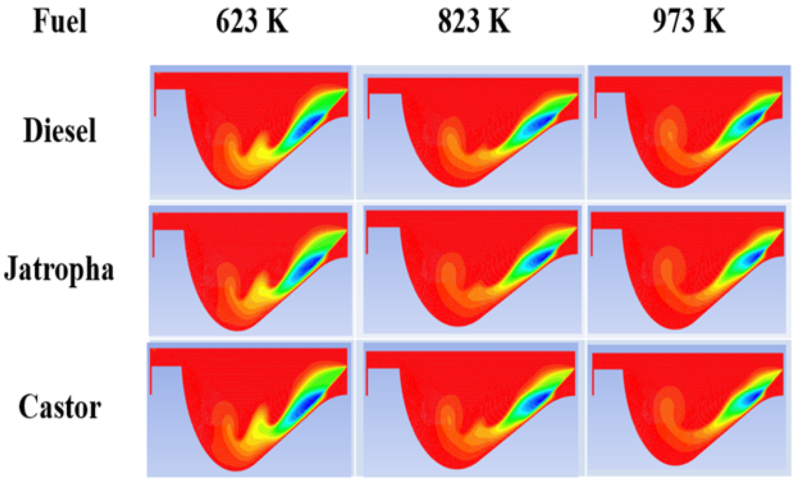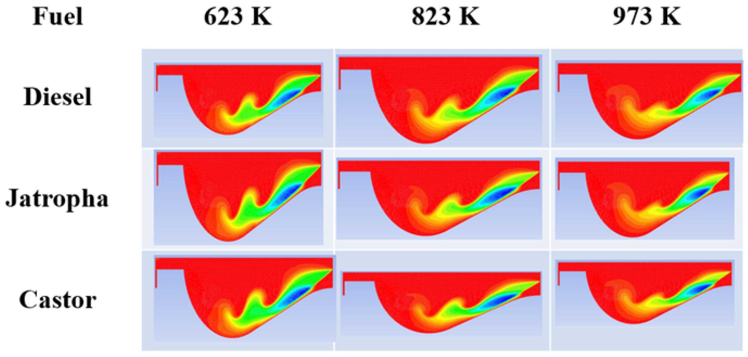Figure 9, the temperature contours of 25-micron droplets are shown for all fuels. The minimum temperatures for diesel fuel are 589, 745, and 851 K, respectively. Similarly, for Jatropha biofuel, the minimum temperatures are 588, 742, and 841 K at 623, 823, and 973 K, respectively. In contrast, the minimum temperature values for Castor biofuels are 591, 747, and 849 K, respectively, at the given temperatures. The green and yellow areas are greater for the 25-micron droplet spray than for the 20-micron droplet spray. In the 25-micron droplet spray, these green and yellow areas are greater at 623 K, the lower temperature, and decrease with increasing ambient temperature, as evident in