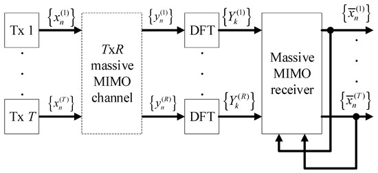 Block diagram of massive Multiple Input–Multiple Output (m-MIMO) with Single-Carrier with Frequency-Domain Equalization (SC-FDE) signals.