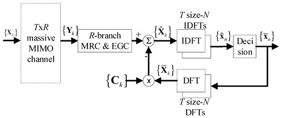 Based on , we can implement the MRC or EGC, in the frequency domain. Nevertheless, for moderate values of , the residual interference can still present a certain level. In order to mitigate this, we implement the iterative receiver (interference canceller), depicted in Figure 2, as: