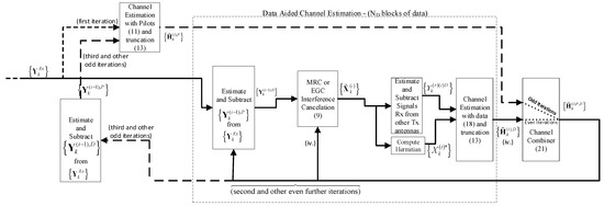 The procedure for obtaining the channel estimates follow iteratively the following three steps (see indexes in the chains of Figure 3):