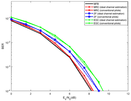 Figure 5 shows the performance results for 4 × 32 MIMO with conventional pilots and different iterations of the interference cancellation. Even with 1 iteration, the MRC performs better than the ZF. As before, although with lower processing complexity, the EGC performs worse than the ZF. Note that, with MRC and with EGC, a certain level of interference is generated, because these receivers are not optimum. In order to mitigate such interference, the proposed receiver incorporates an interference cancellation.