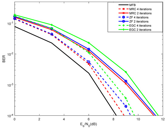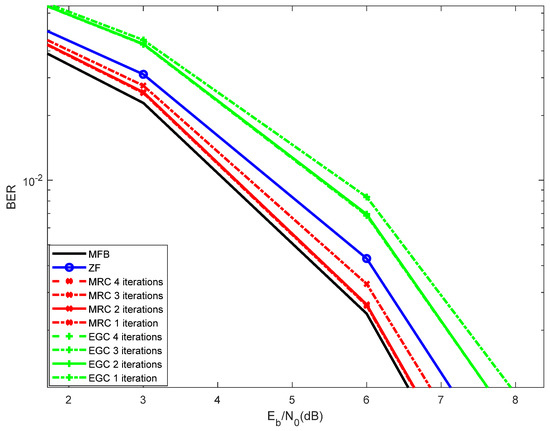 As can be viewed from Figure 5, the best performances, of both MRC and EGC, are achieved with four iterations. Nevertheless, the performances obtained with four iterations are close to those obtained with three iterations. It is also observed a degradation of performance when a single iteration is assumed. Using the interference cancellation associated with the MRC and EGC, one can choose between three or four iterations, as the difference is residual. Beyond four iterations, the performance improvement was almost negligible (not shown in Figure 5). It is shown that the best performance is achieved by the MRC with 4 iterations.