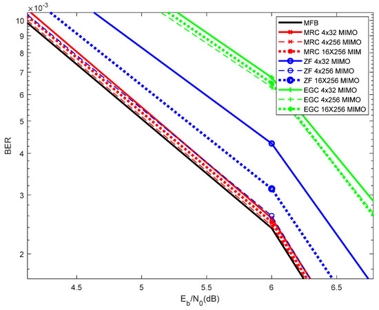 Figure 6 compares the performance of the 4 × 32 MIMO against 4 × 256 MIMO and 16 × 256 MIMO. As expected, due to the higher level of receive diversity, the 4x256 MIMO performs better than the 4 × 32 MIMO. Nevertheless, it is noticeable that 16 × 256 MIMO performs worse than 4 × 256 MIMO. This occurs because the 16 × 256 MIMO comprises 16 parallel flows of symbols, while 4 × 256 MIMO comprises only 4 parallel flows of data, and therefore 16 × 256 MIMO corresponds to more data being transmitted, but also to more interference. This is valid for the MRC, EGC and ZF. It can be viewed that the results obtained with the MRC, for the 4 × 256 MIMO, are almost superimposed with the MFB curve.