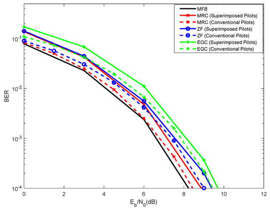 Figure 7 considers the performance results obtained with superimposed pilots compared with those obtained with conventional pilots. The superimposed pilots consider pilots power of 0 dB (pilots with the same power as the data), with a block length of five blocks of data symbols used to estimate the channel, and four iterations of the iterative channel estimator. As can be viewed, although the performances obtained with conventional pilots are slightly better than those obtained with superimposed pilots, the differences are residual. Nevertheless, superimposed pilots present the advantage of not having to reserve a certain bandwidth for the purpose of estimating the channel. Regardless of whether superimposed or conventional pilots are employed, the best overall performance is obtained with the MRC, being followed by the ZF and, finally, by the EGC. Once again, the ZF performs worse than the MRC because the former presents noise enhancement.