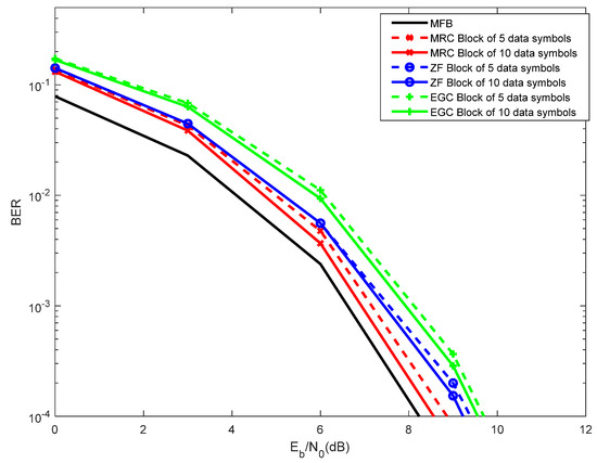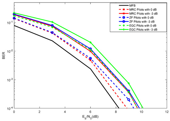 Figure 9 considers the performance results with superimposed pilots, assuming a pilots power of 0 dB versus −3 dB, using a block length of 5 data symbols. It is worth noting that 0 dB corresponds to using the same power for the pilots and for the data, whereas −3 dB corresponds to using half of the power for the pilots, as compared to the data power. Regardless the receiver employed, the best overall performance is always achieved with a pilots power of 0 dB. It is worth noting that simulations with a pilots power of 3 dB were implemented (not shown in this article), but the best performance was also 0 dB. By using −3 dB of pilots power, small degradation of performance can be observed, being valid for both MRC, ZF and EGC.