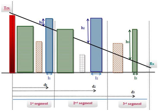 For a given built-up environment, the arising propagation mechanisms are dictated from the transmitter’s height. More specifically, for the case of placing the transmitter well below the rooftop level, the received field (for NLOS conditions) is characterized by multiple reflected rays from building walls, in addition to diffractions from perpendicular building corners [10,11]. By comparison, when the transmitter is placed well above the rooftops, electromagnetic waves propagate above them until they are diffracted down to the receiver [11,12]. For the intermediate case, when the transmitter is placed at a height near building rooftops, a mixture of propagation mechanisms takes place. That is, neither propagation inside streets nor over-rooftop diffraction can be neglected [13]. This situation is difficult to simulate because many propagation mechanisms have to be taken into account.