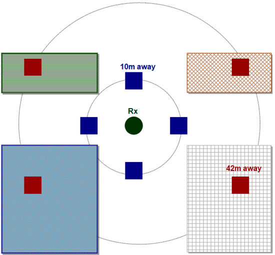 The area under consideration was urban, with randomly distributed dimensions of buildings and roads. The building heights ranged between 5 and 29 m, regardless of the base station’s height. We could therefore characterize the case where the transmitter height is equal to 35 m as a scenario in which the base station is placed well above the rooftops (because even the tallest building would be 6 m below the transmitter). This assumption does not fully hold true when placing the transmitter at 30 m because buildings would exist that have only a 1 m difference in height with the placement of the transmitter, therefore leading to a situation where the base station is placed at a height close to that of the building rooftops.