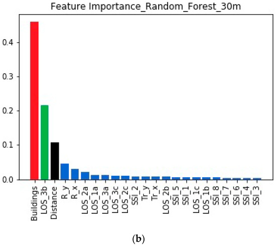 Feature importances, as estimated when the transmitter is placed at 30 m, via two machine learning models: (a) XGBoost; (b) Random Forest. The feature called Buildings is ranked as the most important.